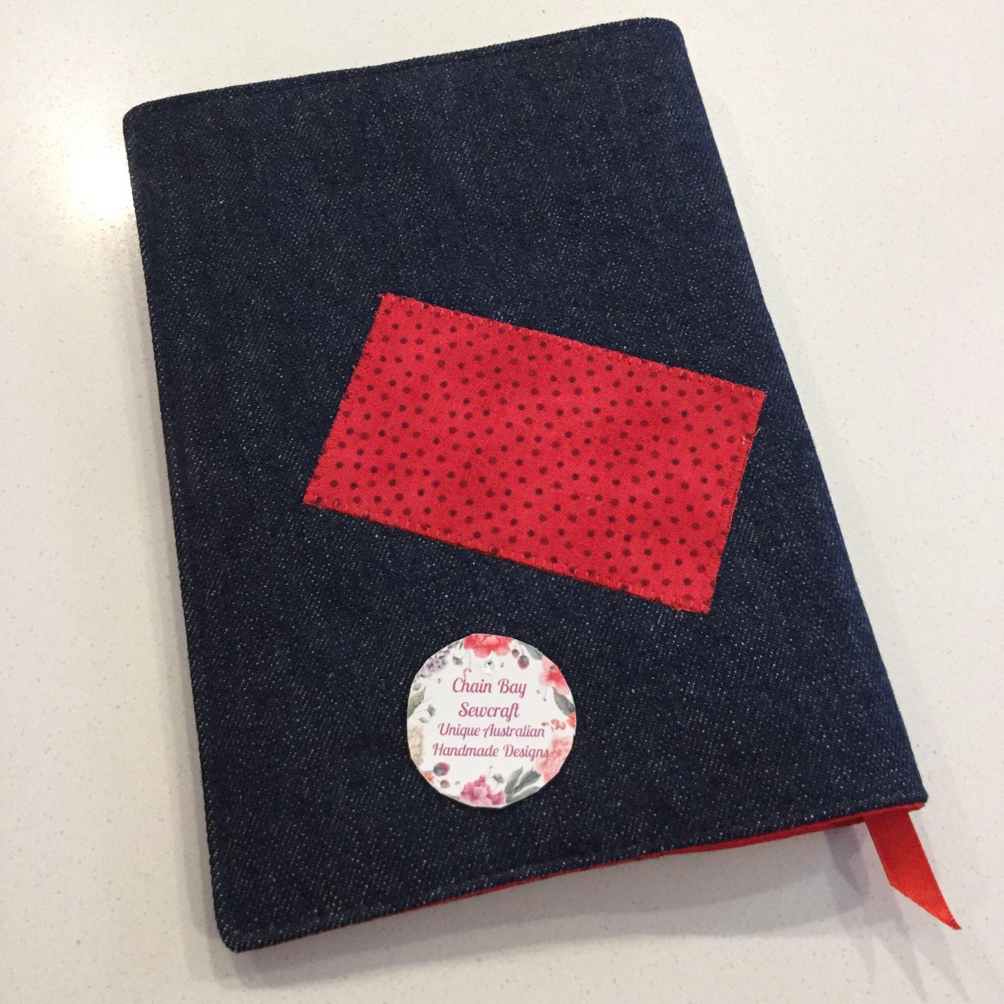 The exterior is made from durable denim fabric with red patchwork fabric shapes. The Journal Cover is handmade with a contrasting 100% cotton lining and fusible interfacing to give it a cushioned feel. Finished off beautifully with a red satin ribbon bookmark