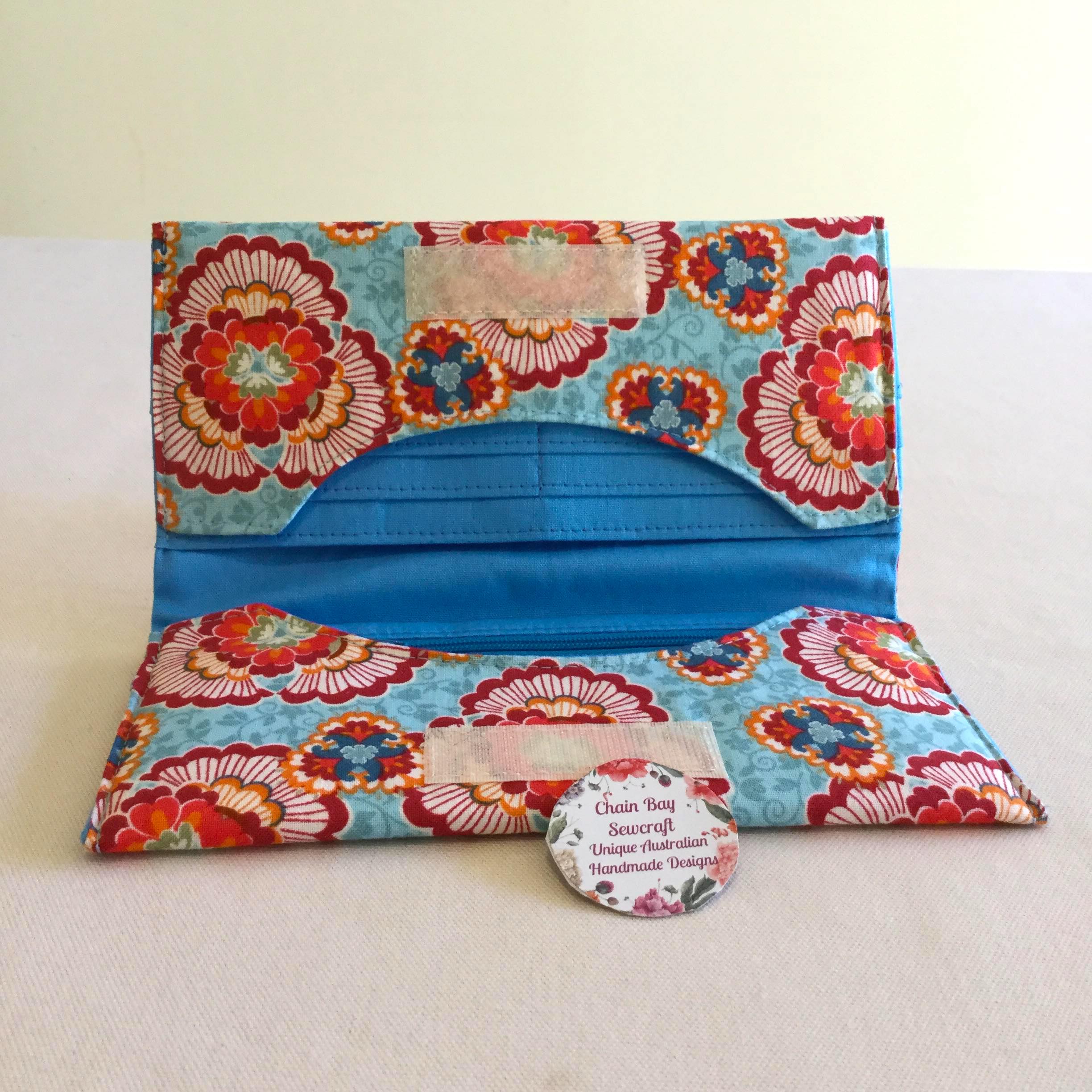 This stylish Aqua Rose Handmade Bifold Ladies Purse is great for keeping all your cards and money in one place. This beautiful aqua marine fabric really makes this purse stand out! It can also be used as a phone pouch. The fabrics used work really well together and make this a stunning purse to take out. It even has a pouch to keep your smaller mobile phone safe. On one side is an area for 8 cards, on the other side is a zippered pocket for coins. Behind each section is a separate area to store your mobile phone, receipts or papers. The purse is secured by velcro fastening