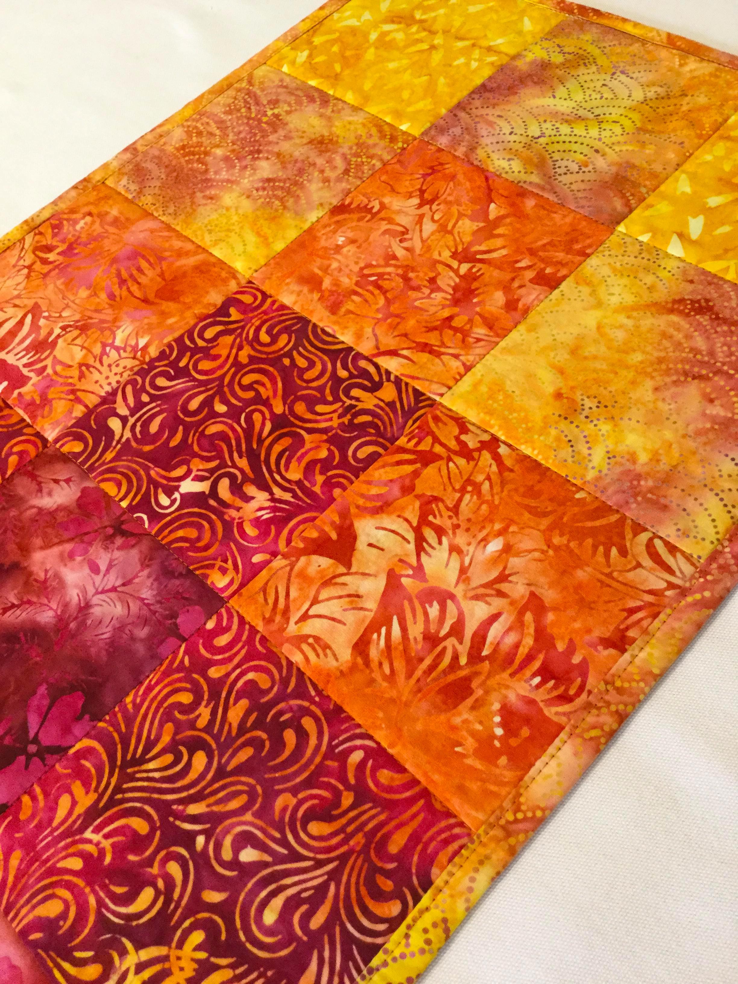 Another stunning Quilted Table Runner reflecting sunsets in our beautiful bay on the South East Coast of Australia! It is made from 100% cotton and vibrant batik fabrics. An inner lining of fusible fleece accentuates the cushioned effect