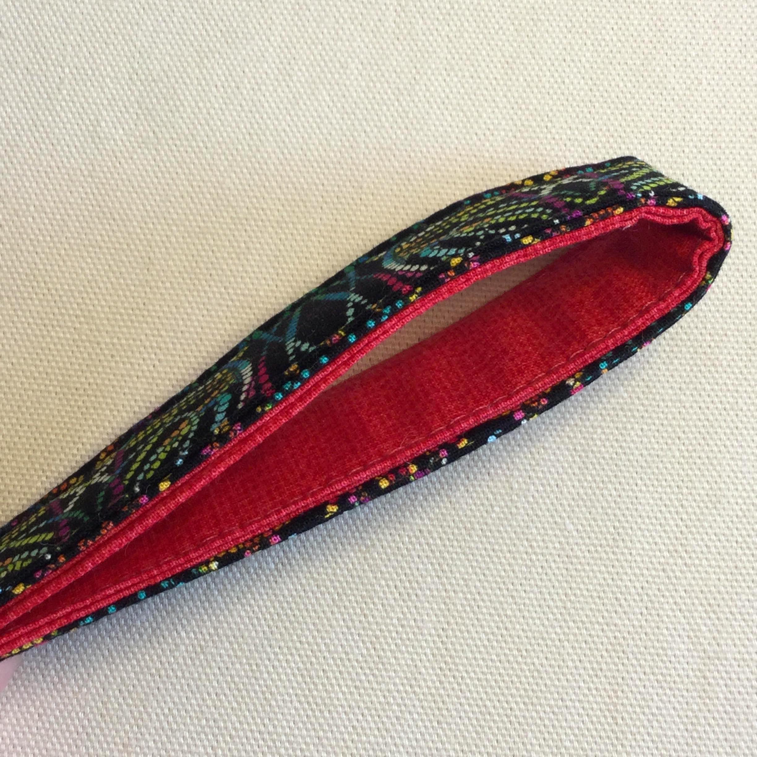 They are made with two bright contrasting fabrics and measure approximately 1″ wide and 6″ long when laid flat. I’ve used a cotton interfacing to give them a textured finish. Includes split ring for your keys. They will fit most wrists or I can make one slightly longer on request