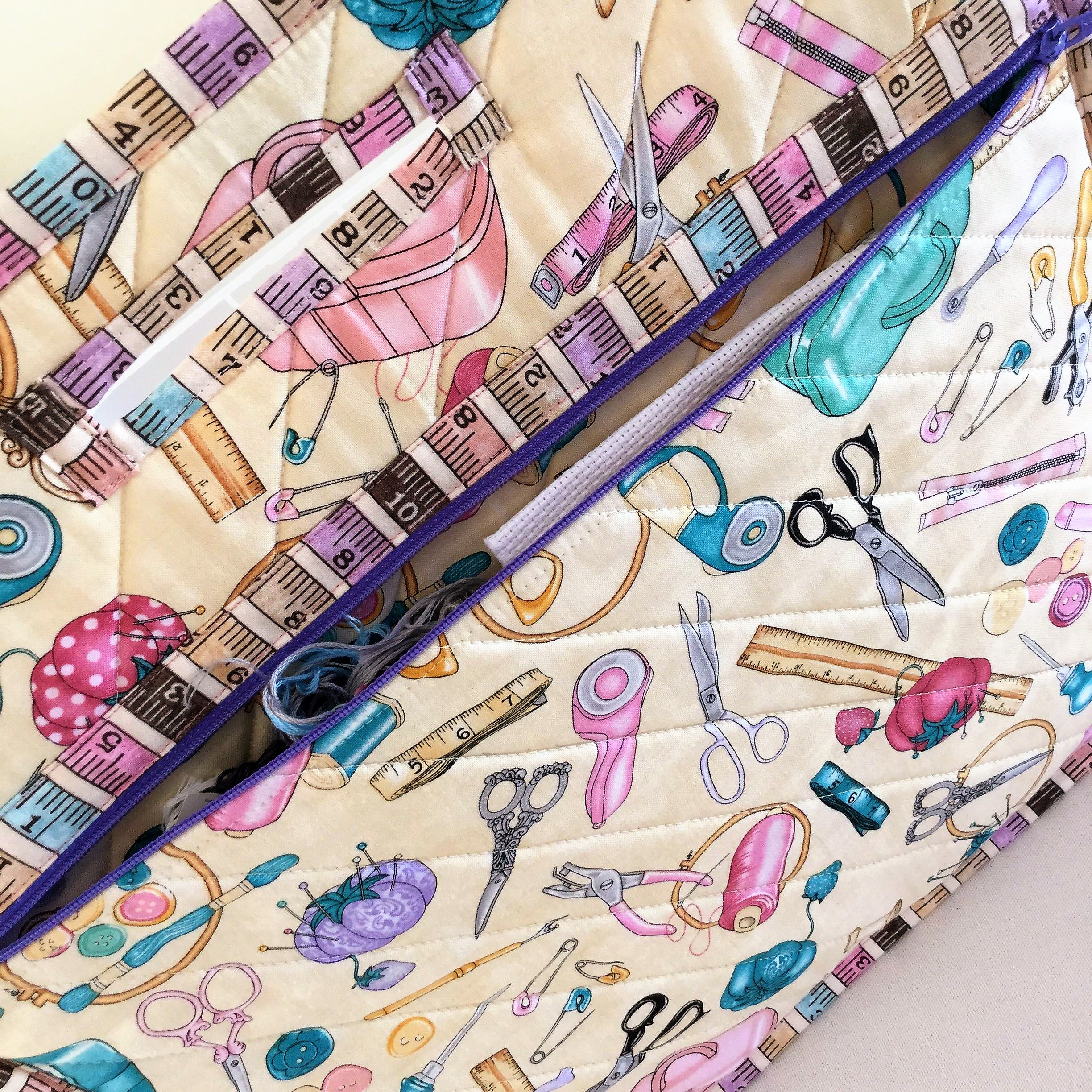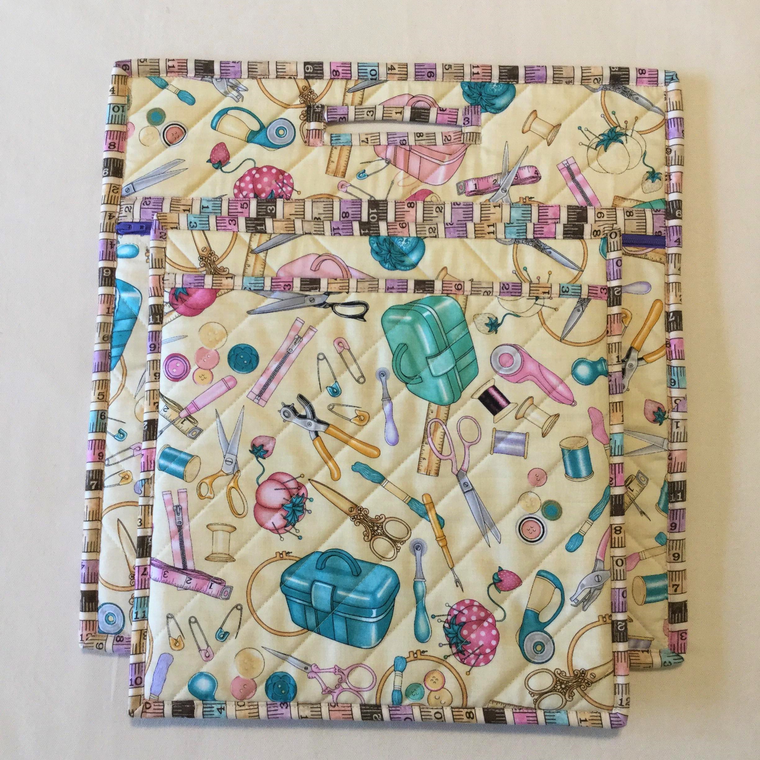 This stylish Quilted Cross Stitch Project Bag Set is designed with the aim of keeping multiple projects organised with separate bags, compartments for canvases, threads and patterns. The fun sewing themed fabric makes this great for lovers of cross stitch and crafting! They are also great for use as a cross-stitch bags, travel sewing bags or retreat bags