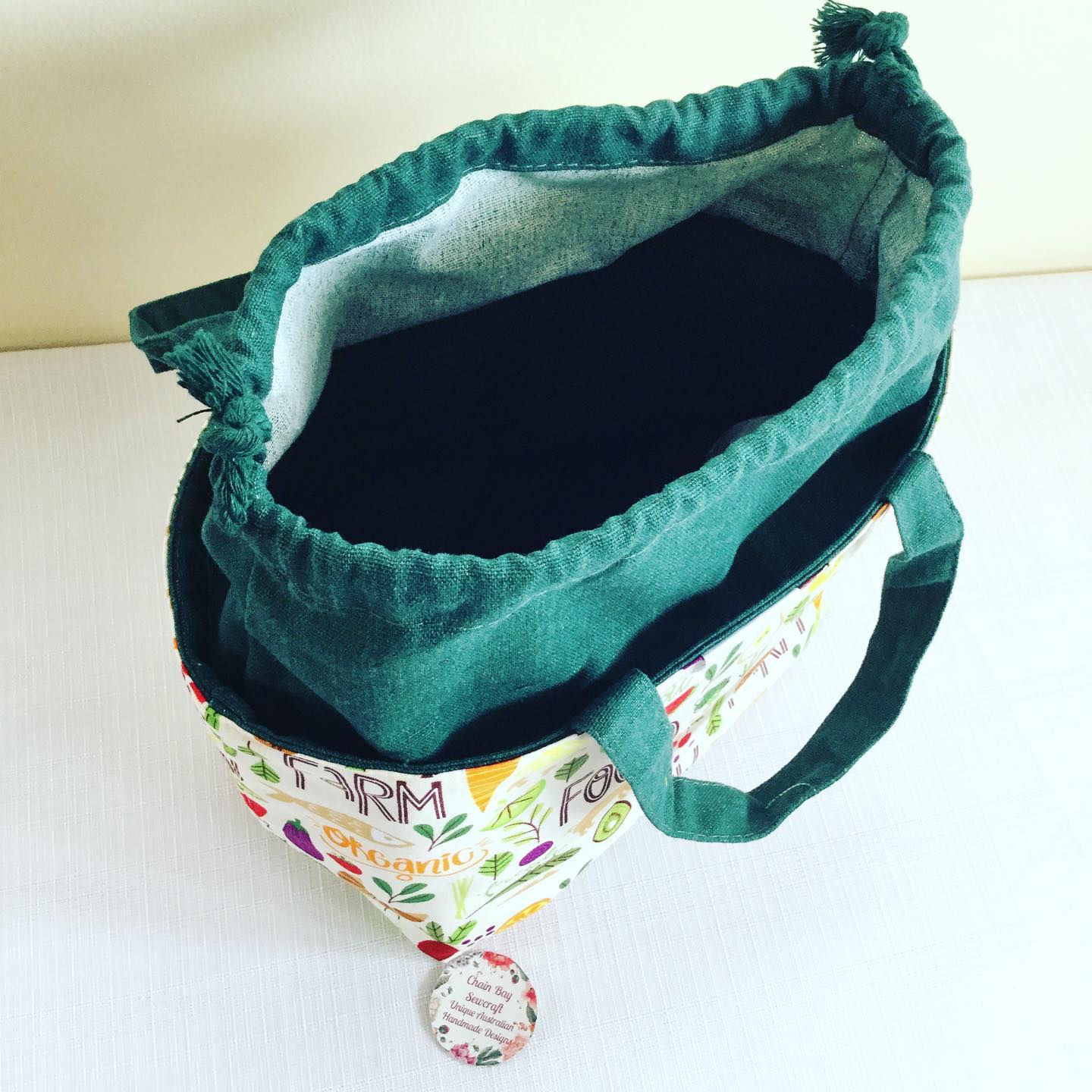 Fabric placement may differ as each drawstring bag is individually made. Accessories not included. Upcycled using existing new canvas bags then adding stylish Chain Bay Sewcraft exterior fabric