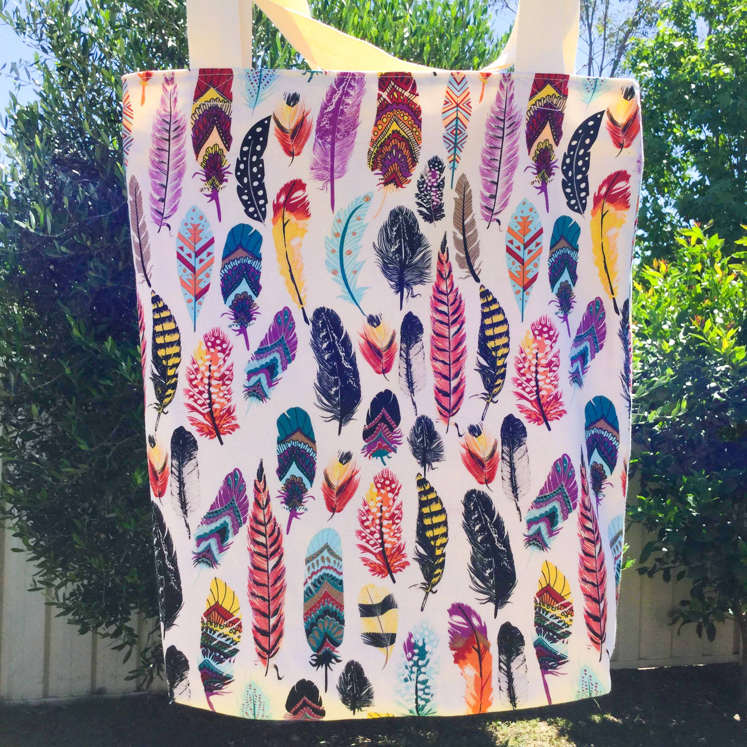 Feathers Reversible Tote Bag. Handmade with 100% cotton exterior and lining. This eye catching feathers fabric really makes this bag stand out in a crowd!