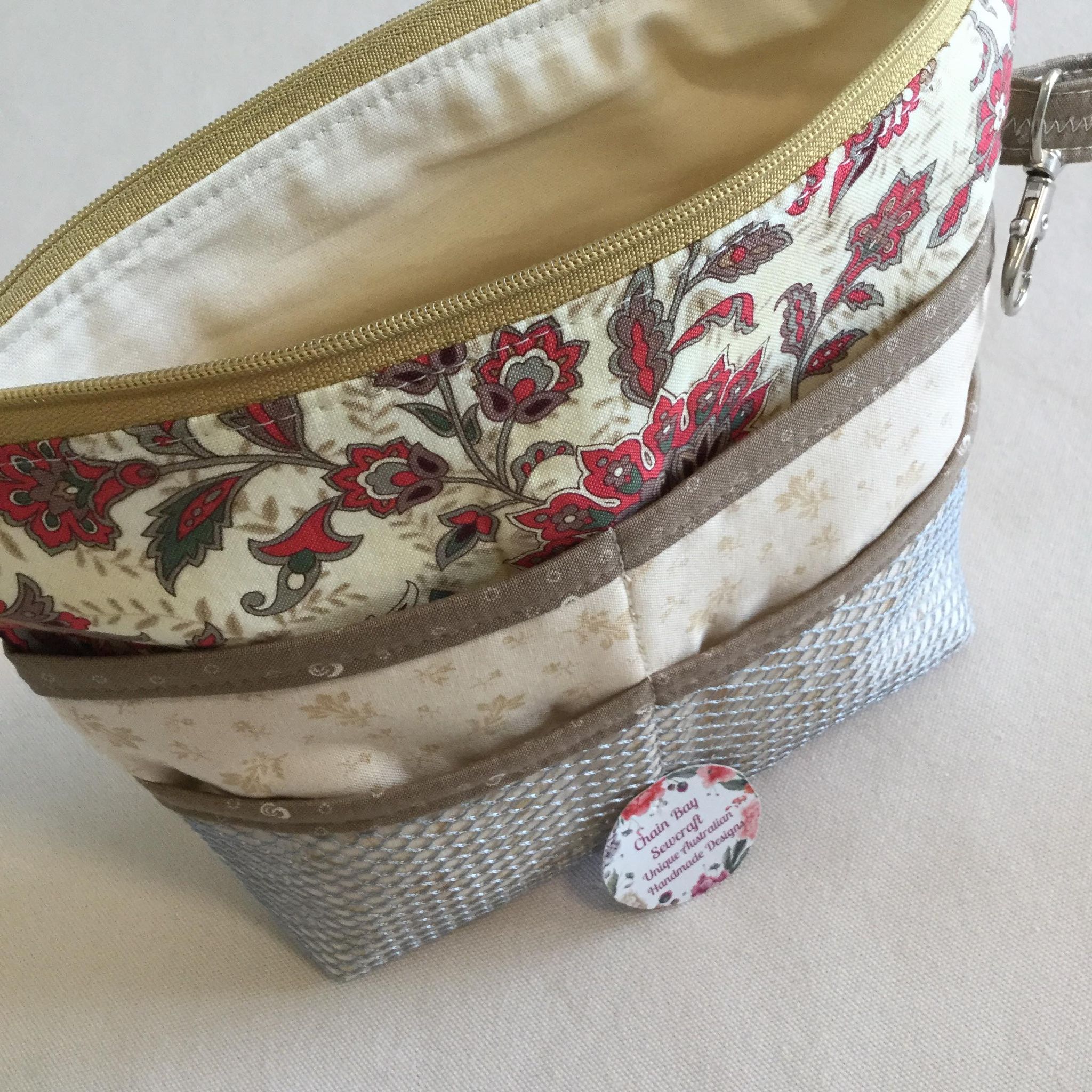 Are you tired of swapping over the contents of your bag each time you change handbags? This Handmade Bag Organiser is great for keeping your essentials in one place. Simply swap bags and go! This bag is made with subtle country cream floral fabrics and a bisque coloured zipper that compliment each other beautifully. Also available with a bright pink zipper and mesh