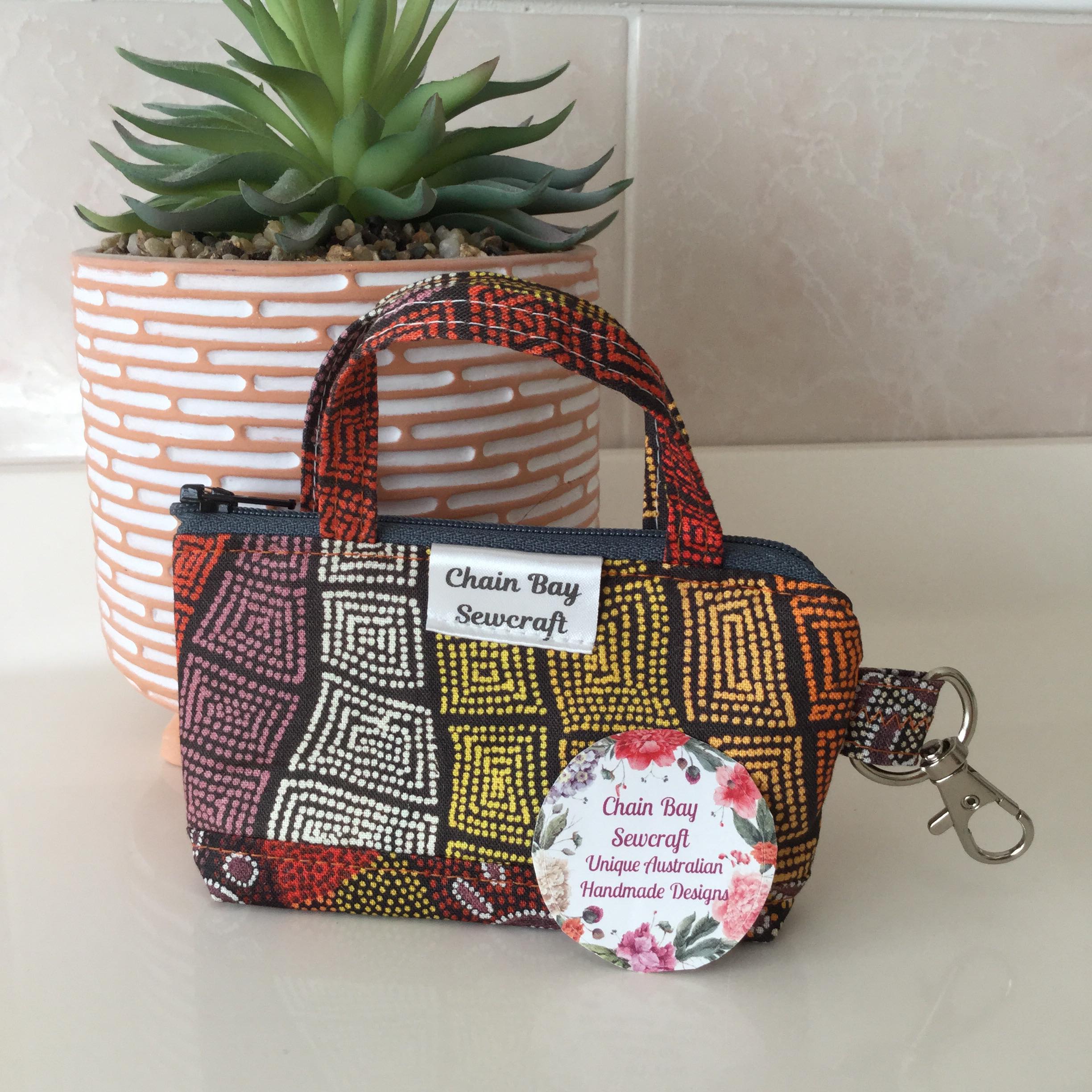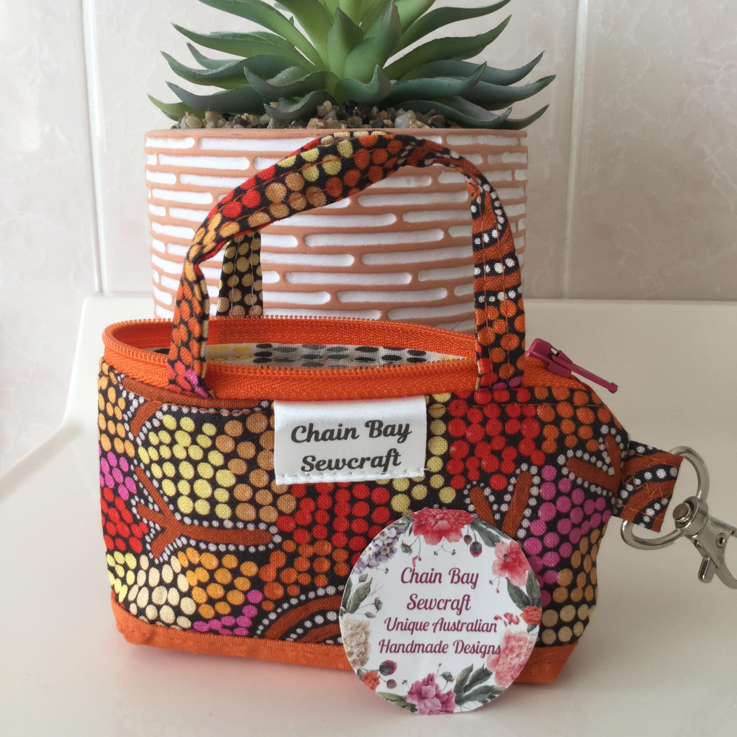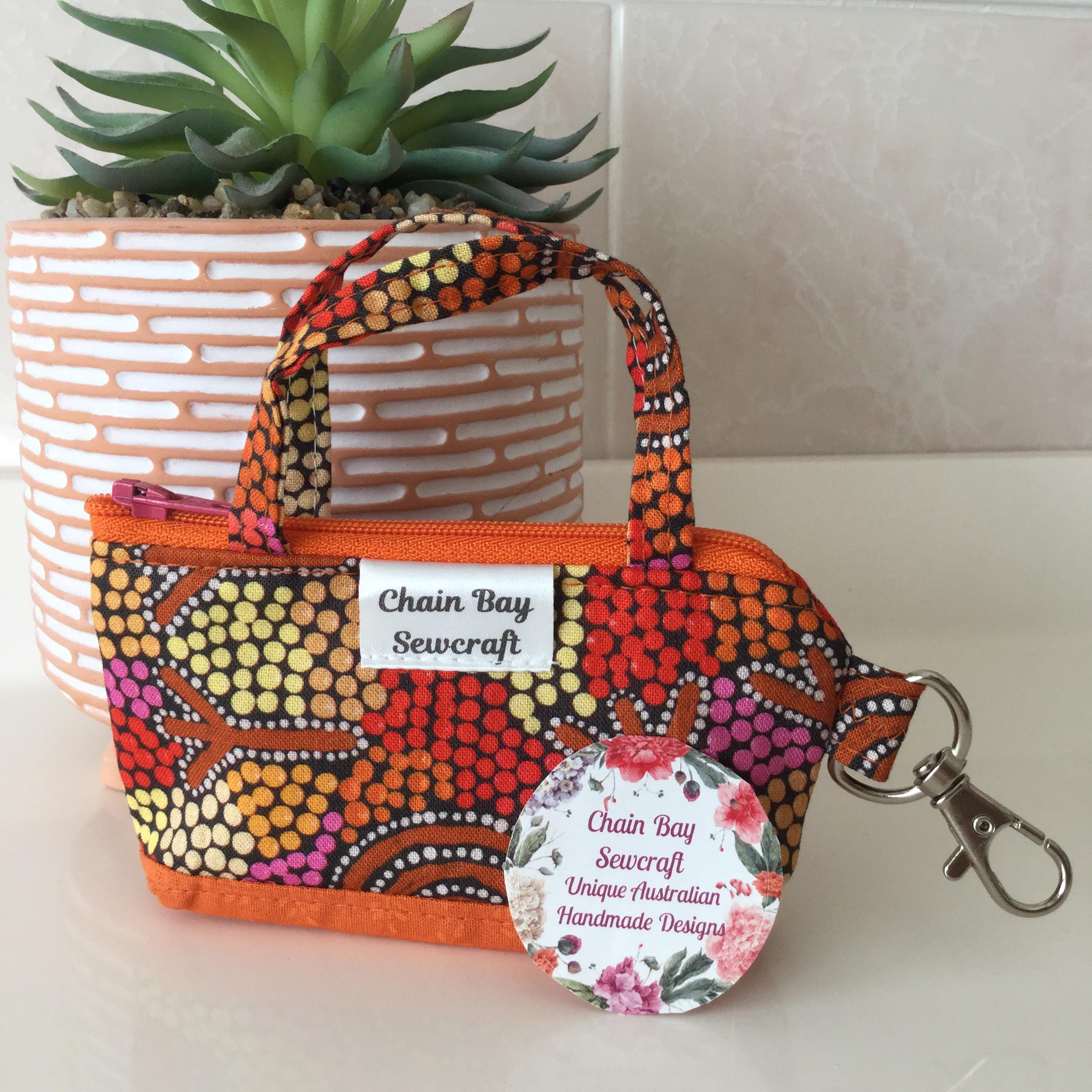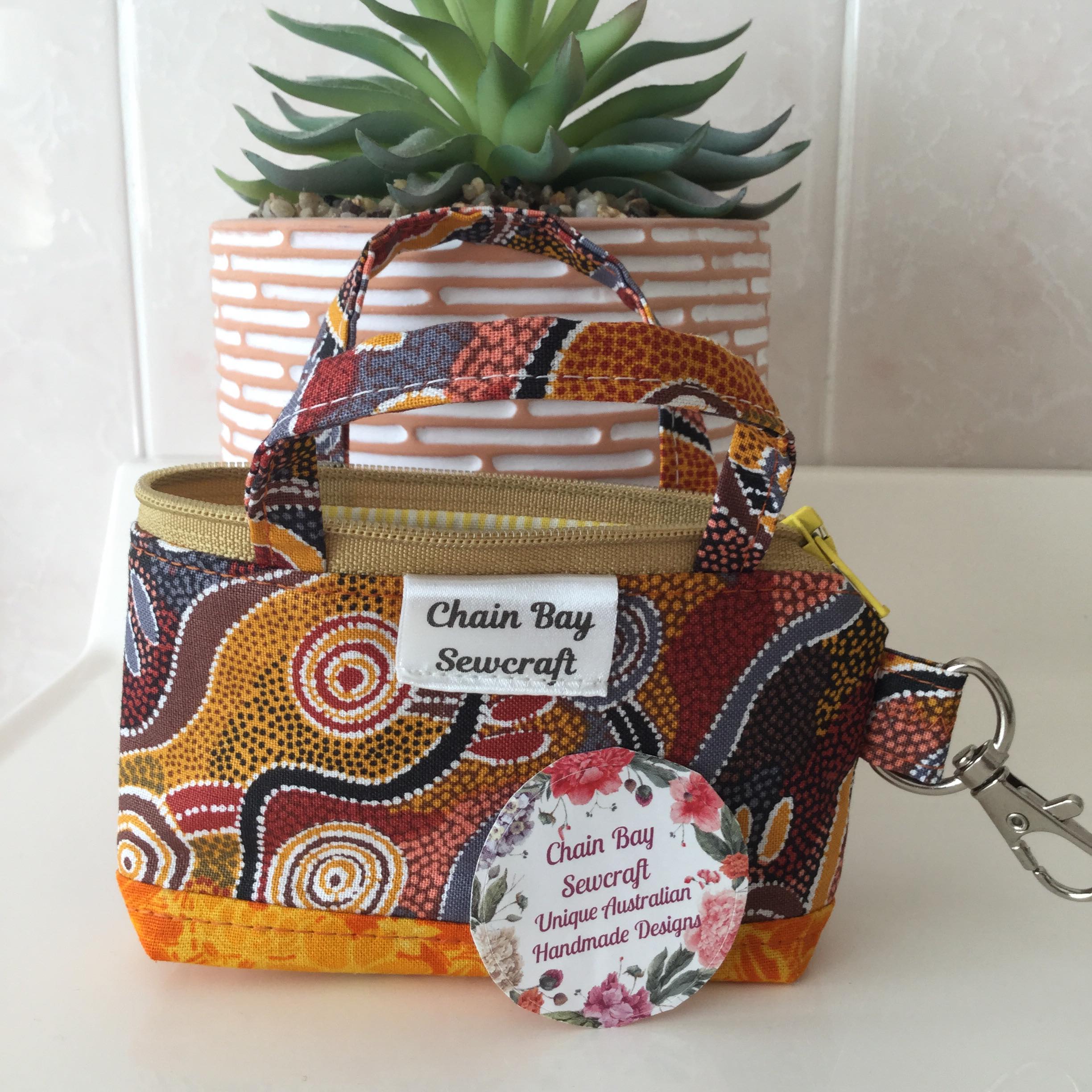 They have a variety of uses, from everyday use in your handbag to travel, a coin purse, storing your jewellery, make up, medication, craft supplies… the possibilities are endless! You can even attach it to your dog lead to hold poo bags & keys. I have now added this stunning 100% cotton ‘wedge tailed eagle dreaming’ fabric by Indigenous artist Glorine Nungarrayi Martin to the collection