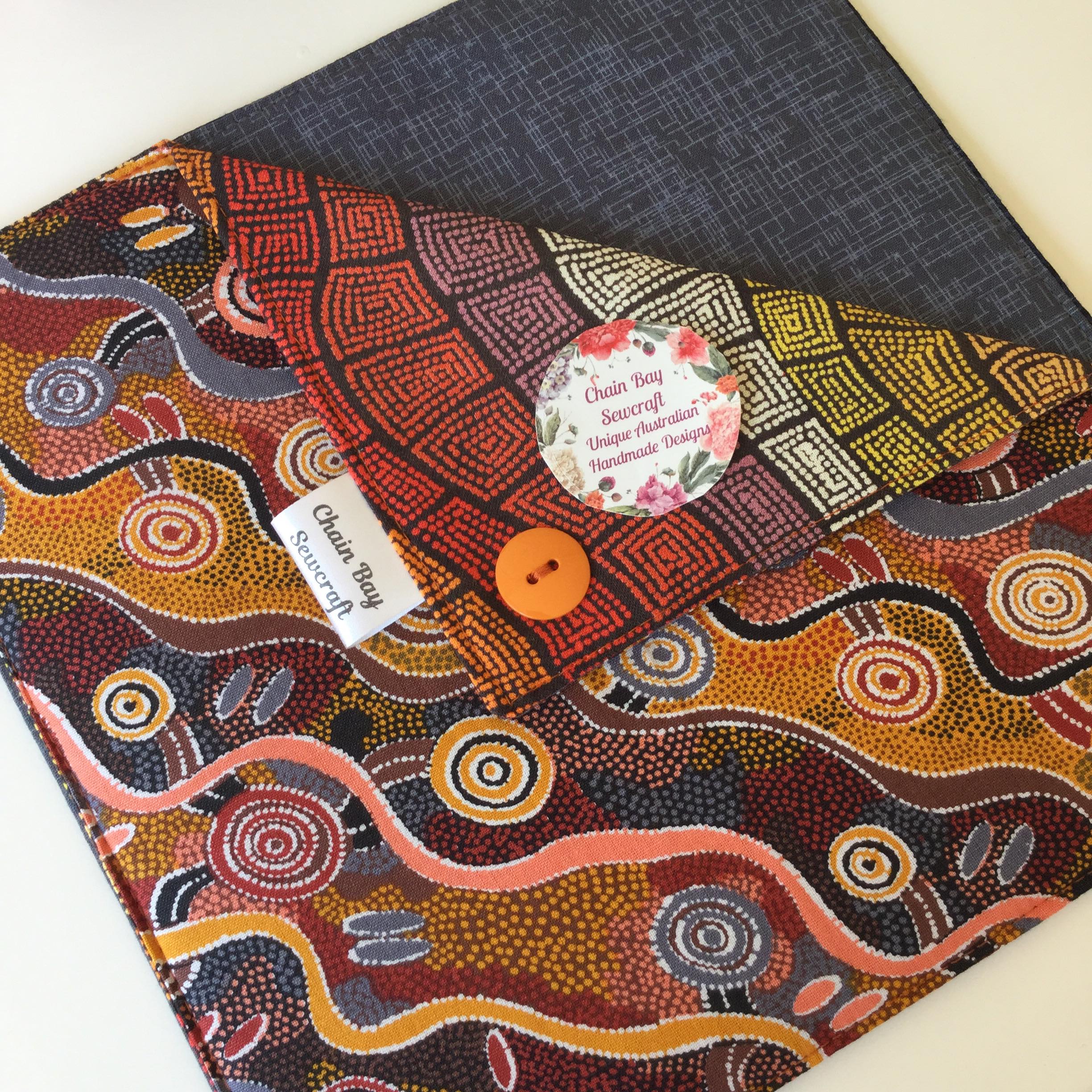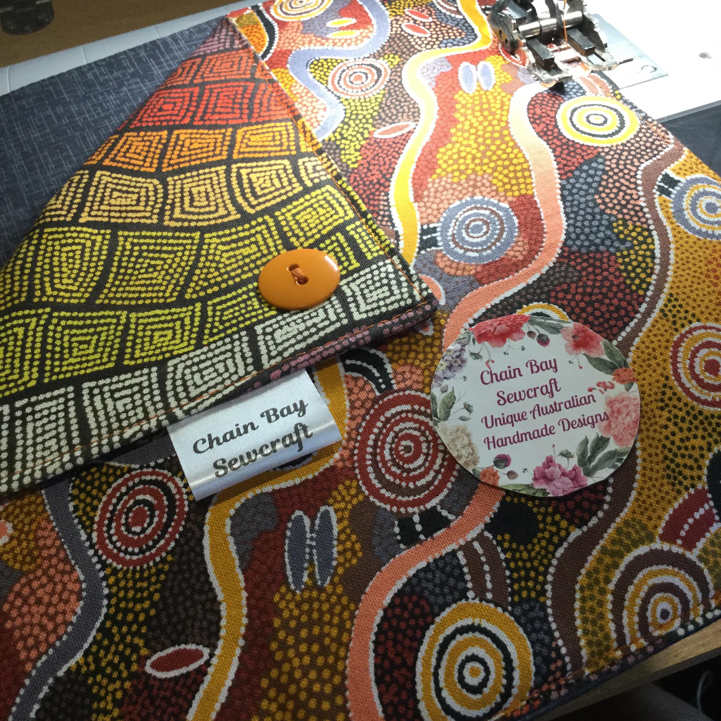 Brighten your table with a stylish Chain Bay Sewcraft Handmade Napkin Holder. You’ll have no more napkins flying away in the wind as they’ll be safely secured in the holder. The stunning Jijaka ‘Desert Tracks’ fabric contrasts beautifully with the sand dunes contrasting fabric. **One available and ready to post** I have now extended my range to include stunning Indigenous Aboriginal Jijaka fabrics. Jijaka is an Aboriginal word meaning kangaroo and is a collection of artworks developed over twenty years by a collective of Aboriginal artists working for the Jumbana Group