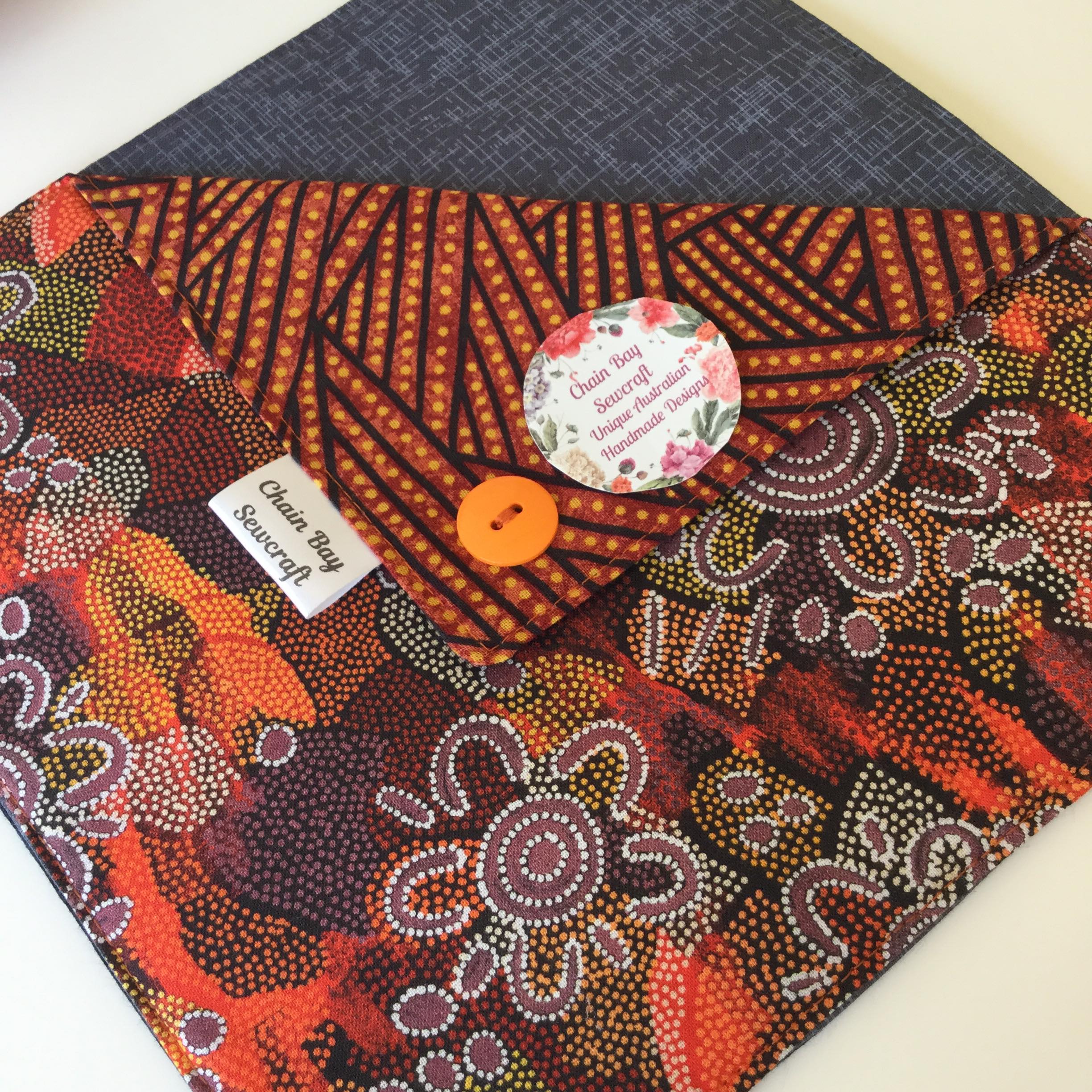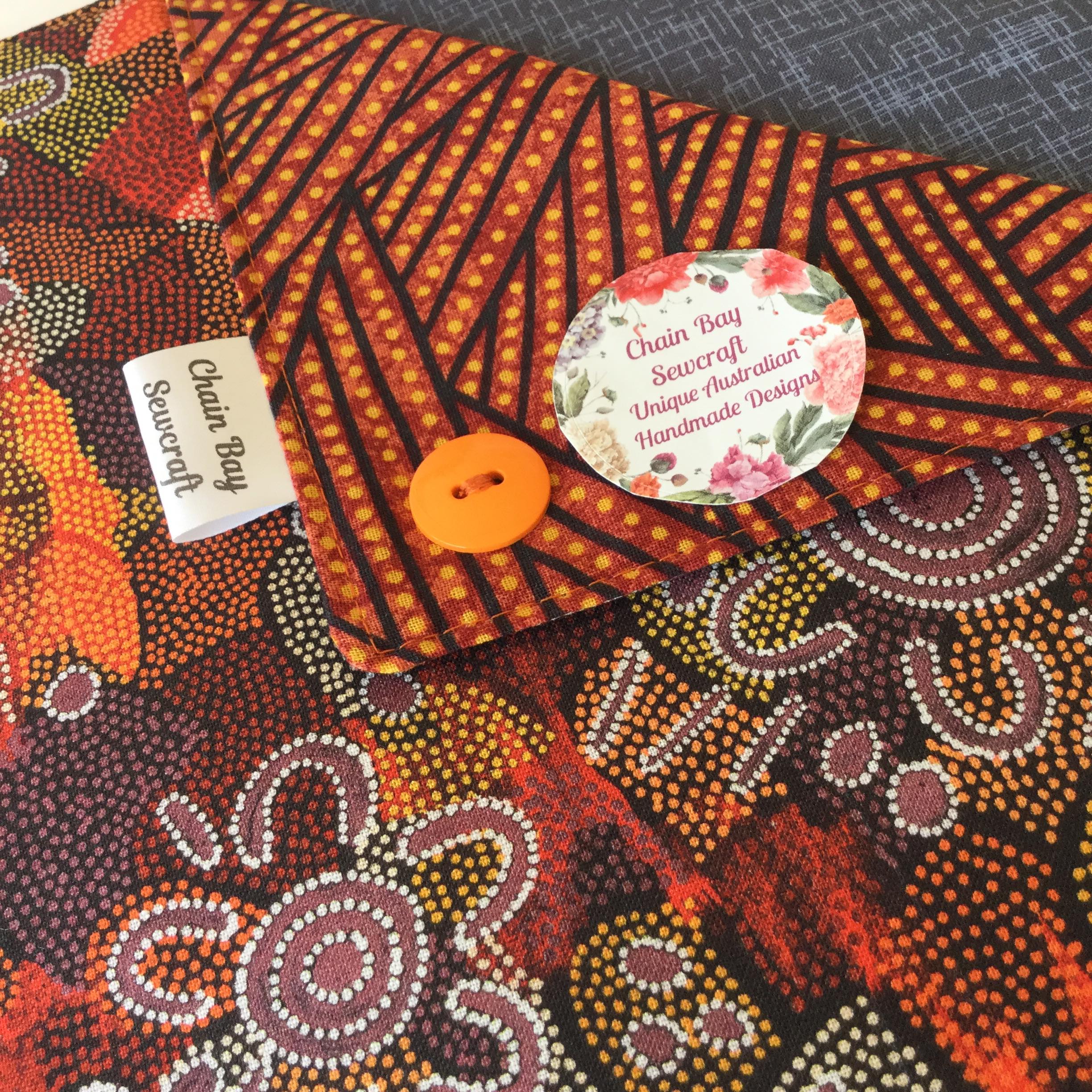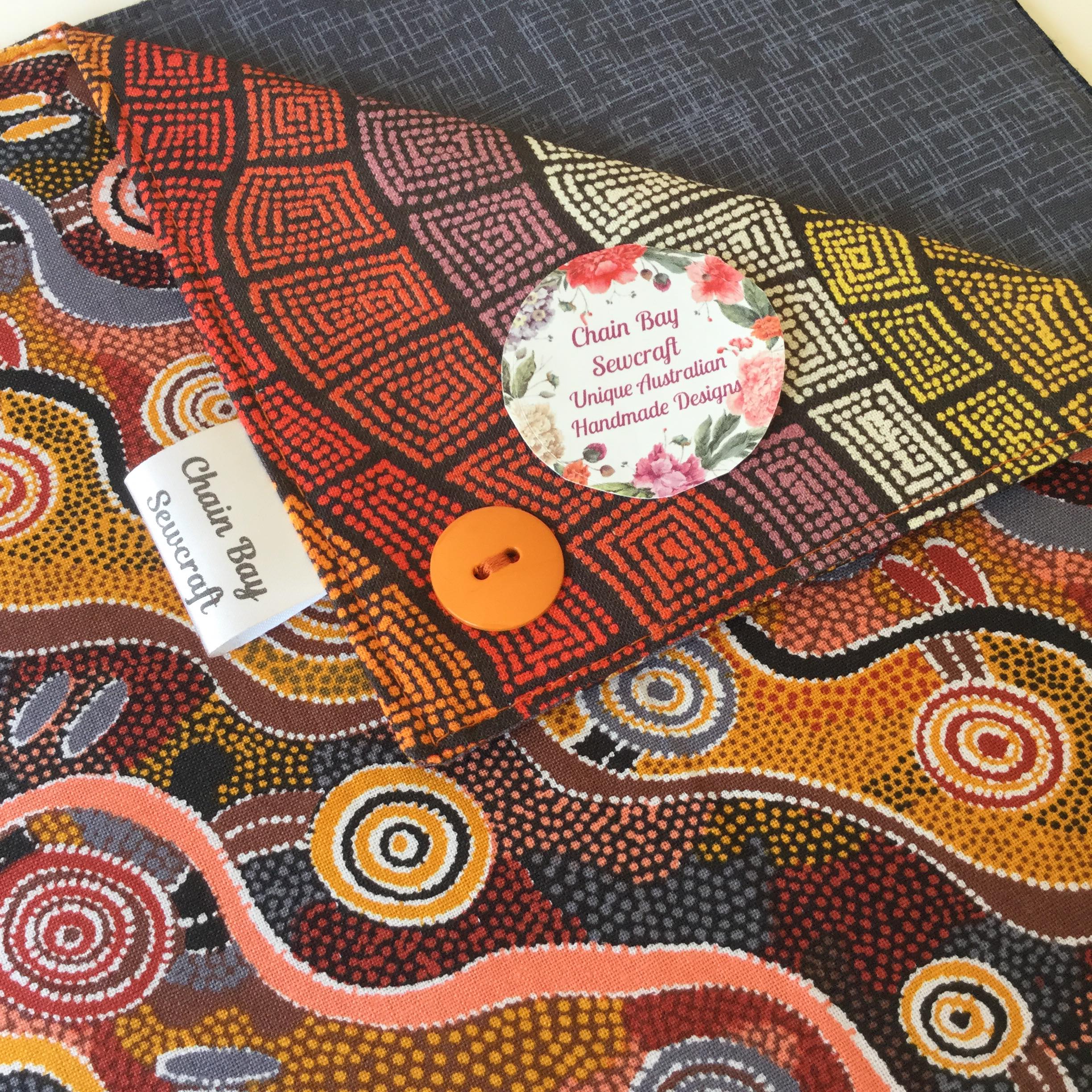 Brighten your table with a stylish Chain Bay Sewcraft Handmade Napkin Holder. You’ll have no more napkins flying away in the wind as they’ll be safely secured in the holder. Handmade with this stunning ‘Women’s Dreaming’ 100% cotton fabric by Indigenous artist Maureen Hudson Nampijinpa with contrasting ‘spirals’ fabric and finished off with a stylish button. **Two available and ready to post** I have now extended my range to include this stunning new fabric from a painting by Indigenous artist Maureen Hudson Nampijinpa. In the painting Maureen depicts large groups of women out searching for bush tucker after rain has softened the ground and stimulated growth. The women are the U shapes (the imprint on the ground when sitting) and beside them are their digging sticks, and the holes. The circles are important dreaming sites in Maureen’s country, called Warlukurlangu
