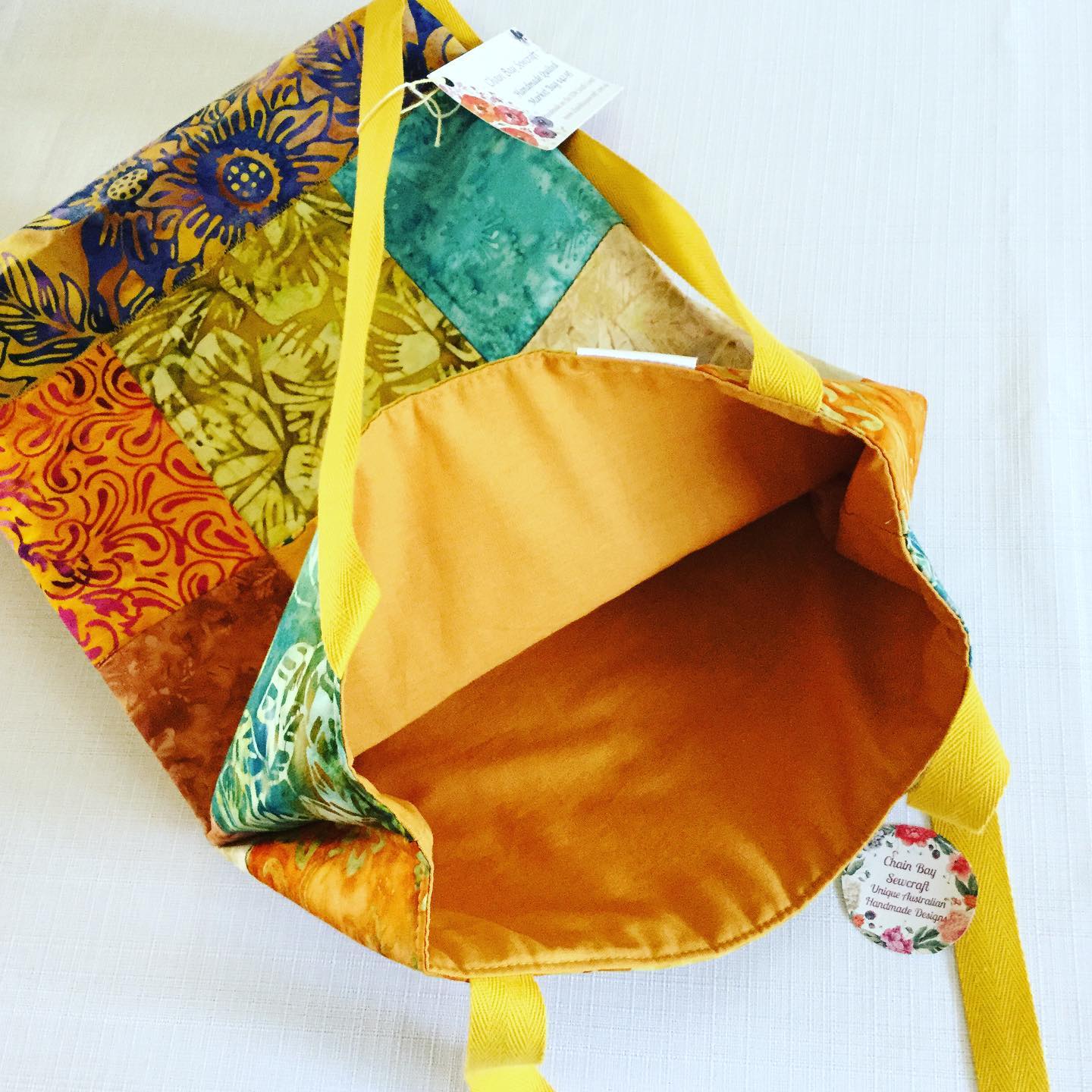 Handmade with high quality batik exterior and 100% cotton lining. Includes strong canvas handles and boxed corners to allow more depth to the bag