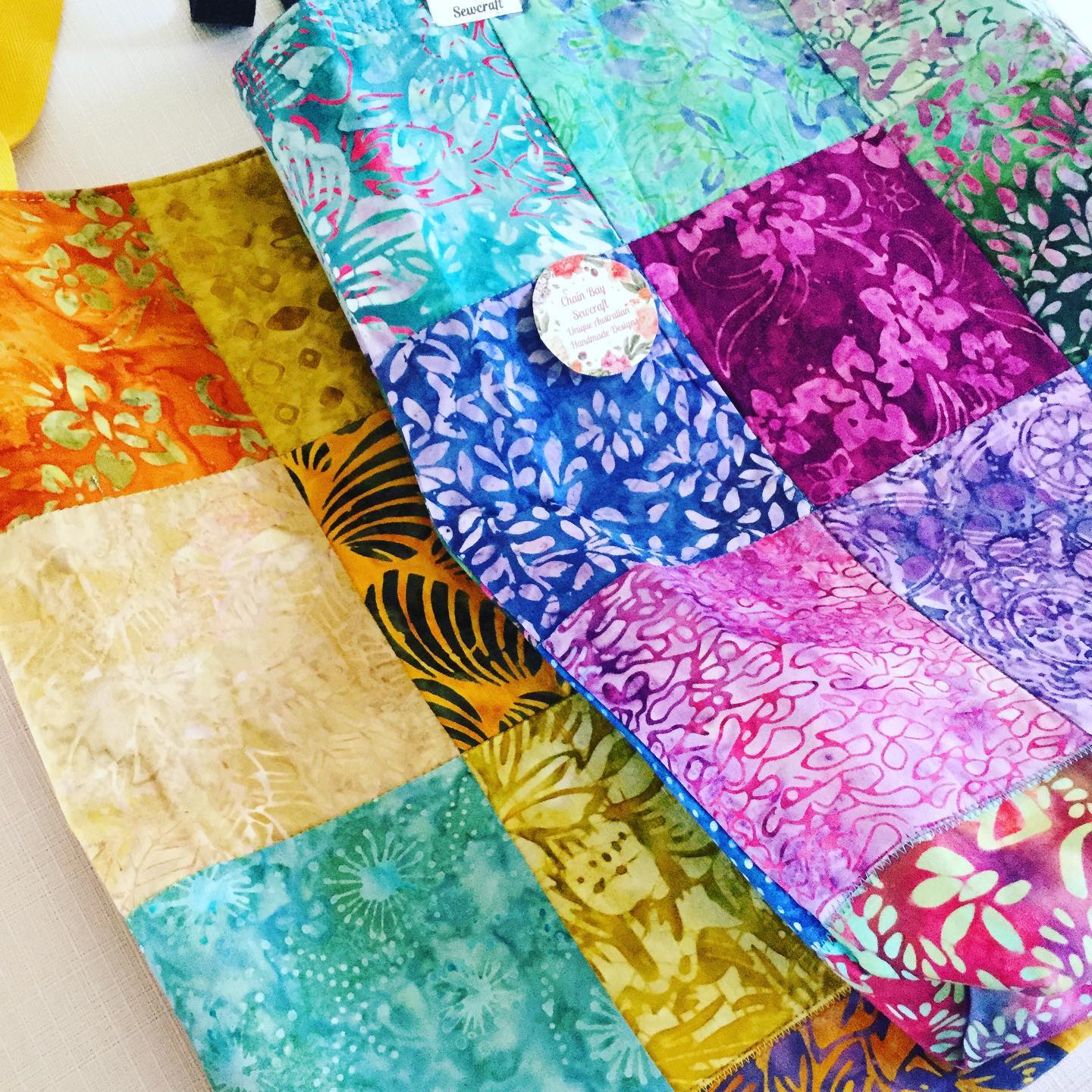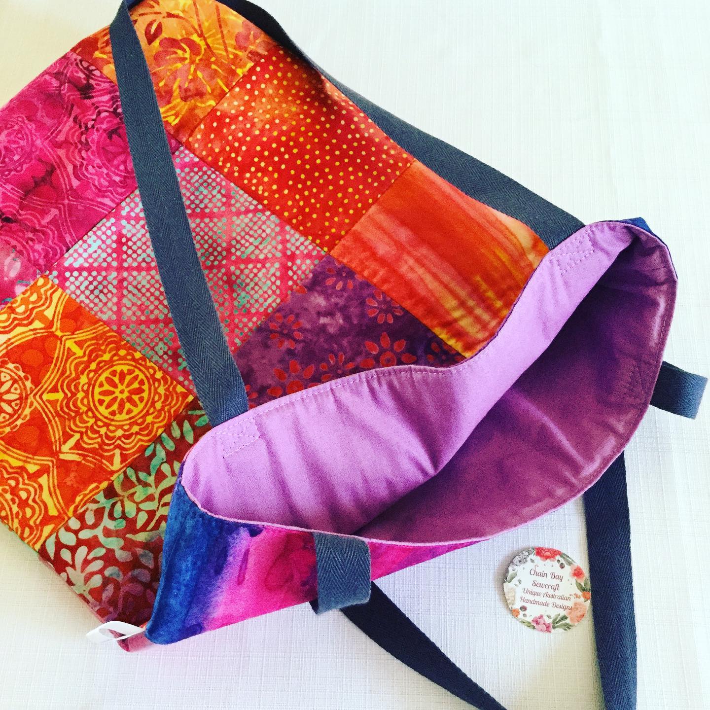 I designed and create high quality quilted patchwork tote bags. Each one is unique with fabric and pattern layout. This new bag looks stunning with the cerise & orange themed batik main patchwork and contrasting multicoloured batik band. The bag is ideal for transporting your treasured things and can be used as a craft bag, baby bag, shopping or library bag or for special days out. The quilted patchwork gives it that special look that makes it stand out from other bags. Only one available and ready to post!