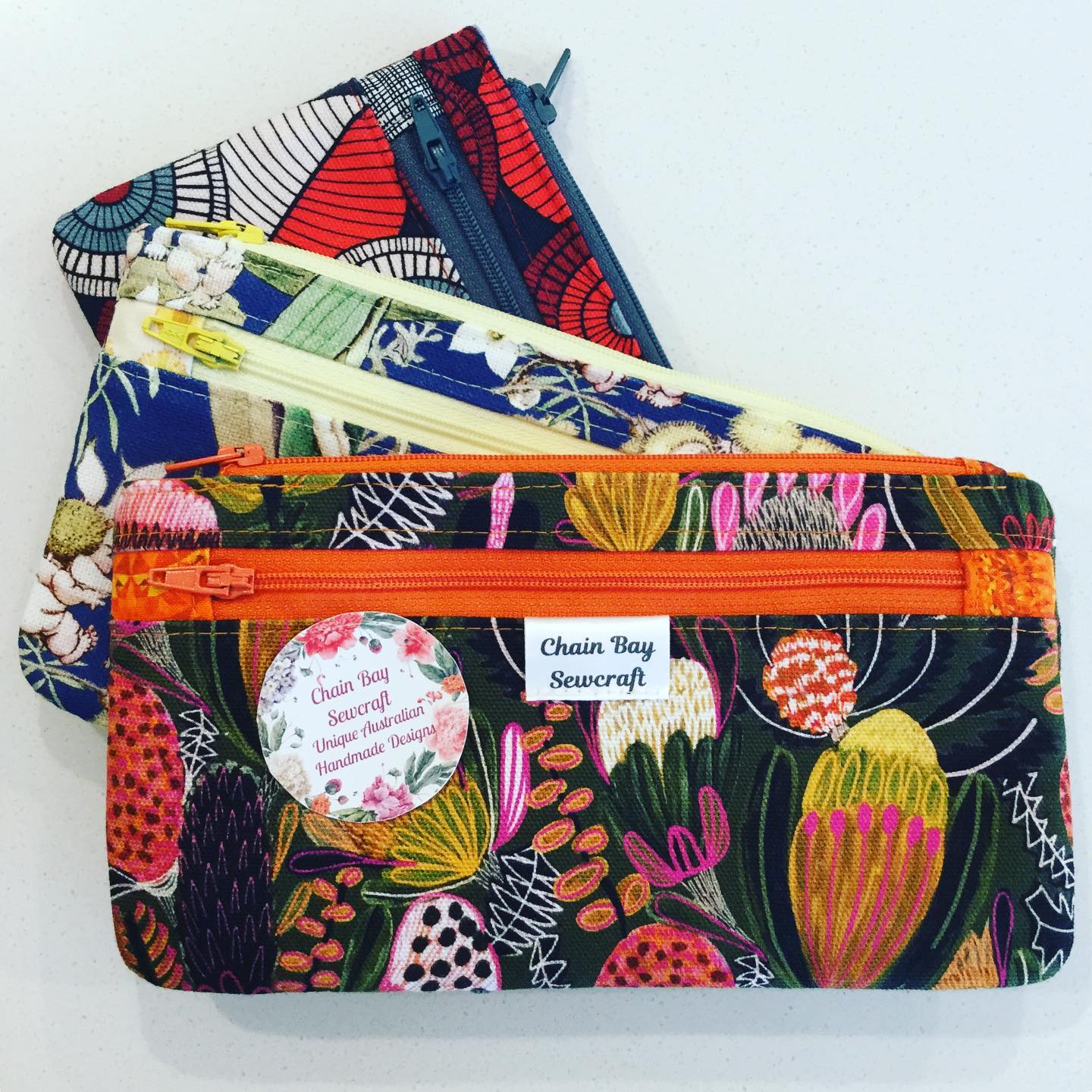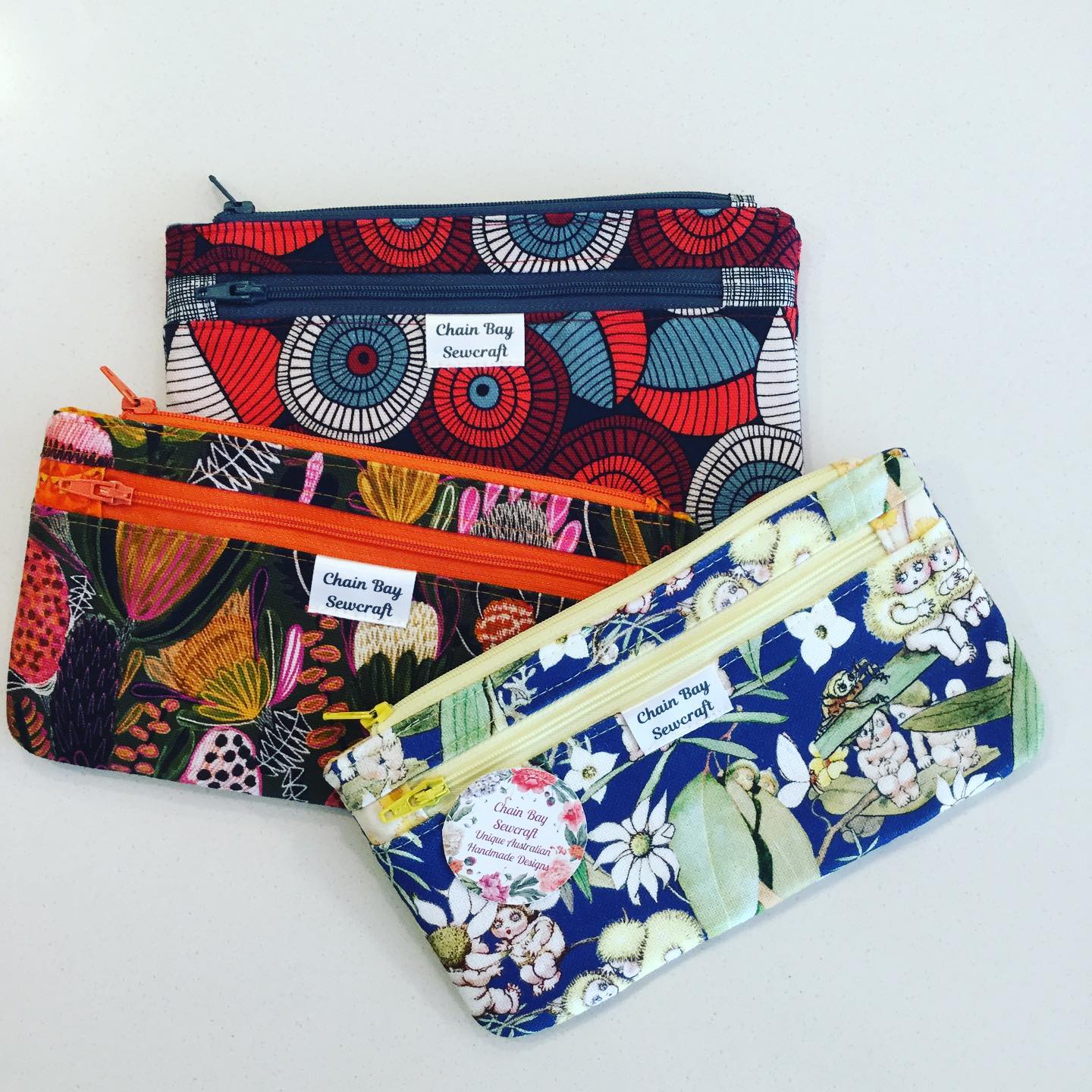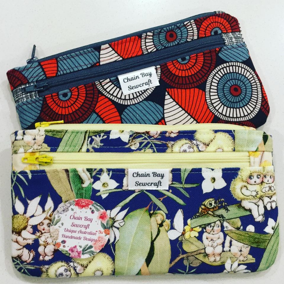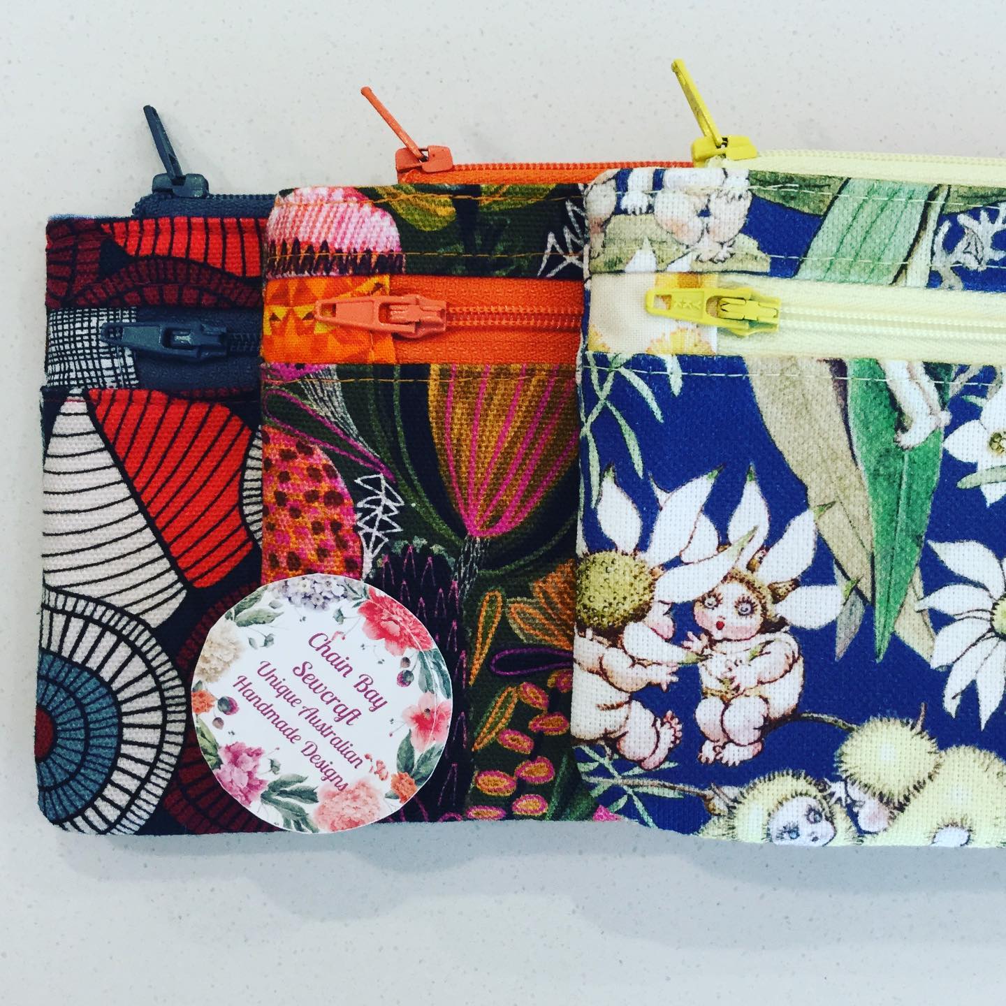 This stylish new Handmade Wallet has two zippered sections and is big enough to store your mobile, keys and essentials. It has a separate zippered side pocket to hold coins and notes. I’ve used fun May Gibbs Gossiping Gum Nuts exterior fabric with a contrasting wattle lining. The wallet is also available in Australian Bouquet and Gum Nuts designs and a variety of stylish Chain Bay Sewcraft handmade purses