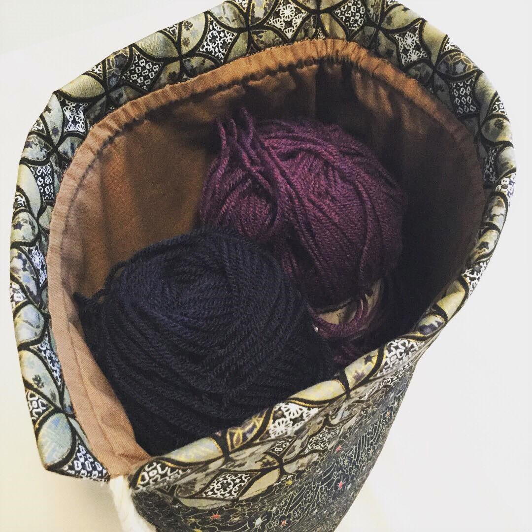 I designed this yarn bag myself and have used a fusible fleece to give a cushioned exterior. The bag has a drawstring top to secure your yarn with a cabled tie. It also has a pull tab handle to make the bag easier to carry around