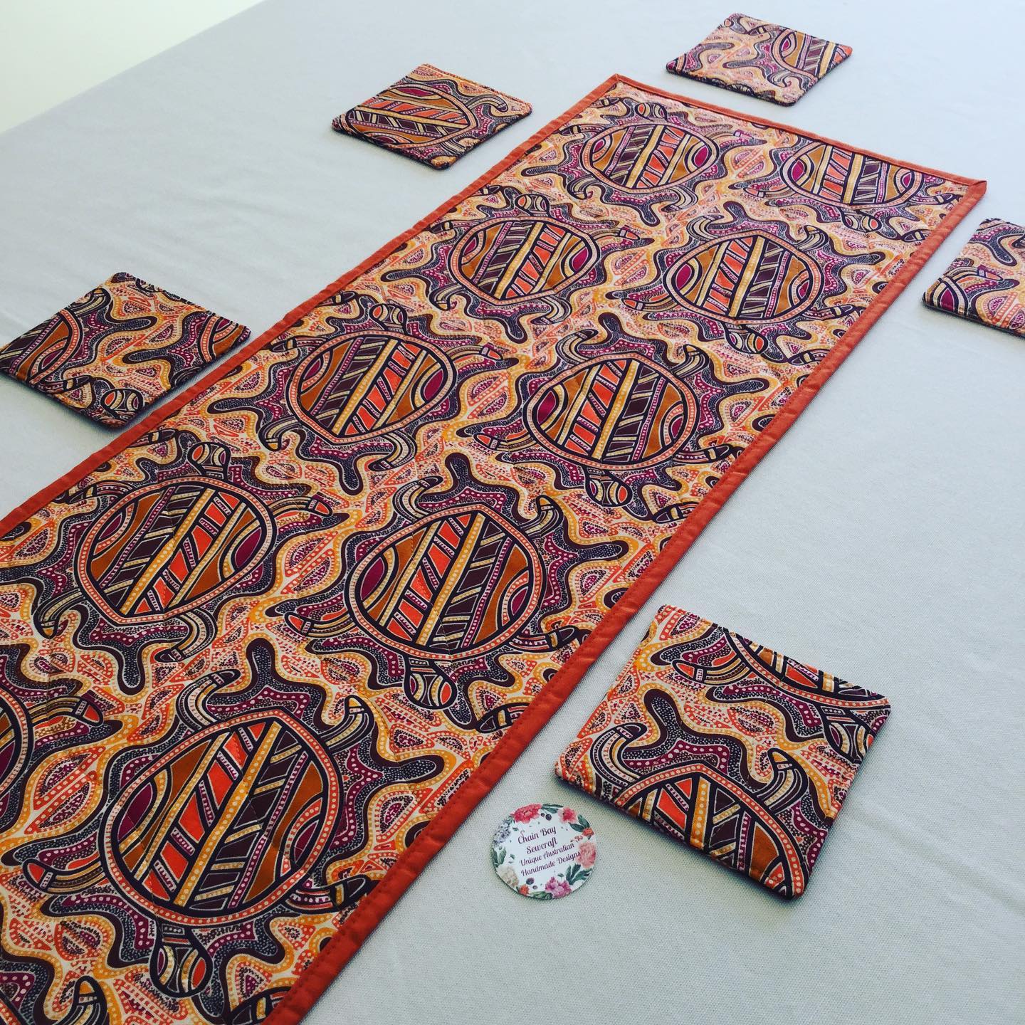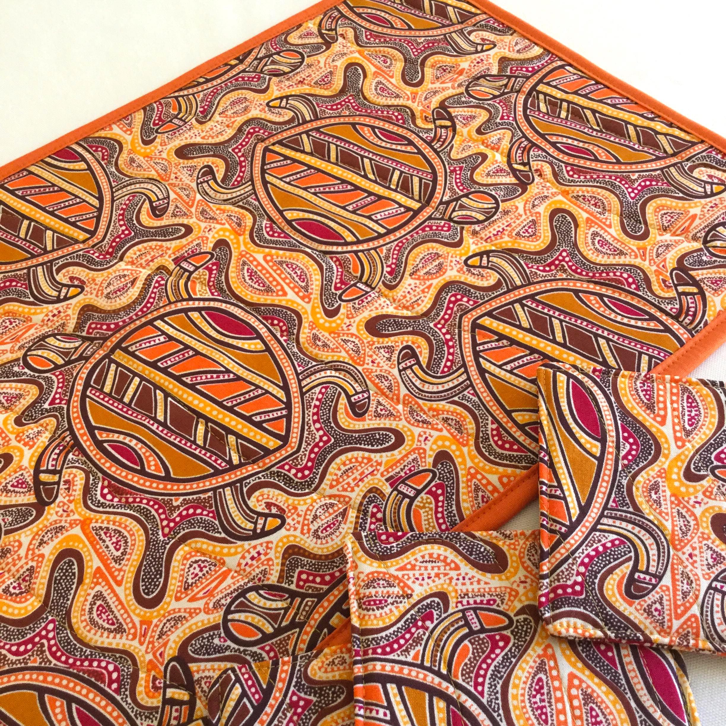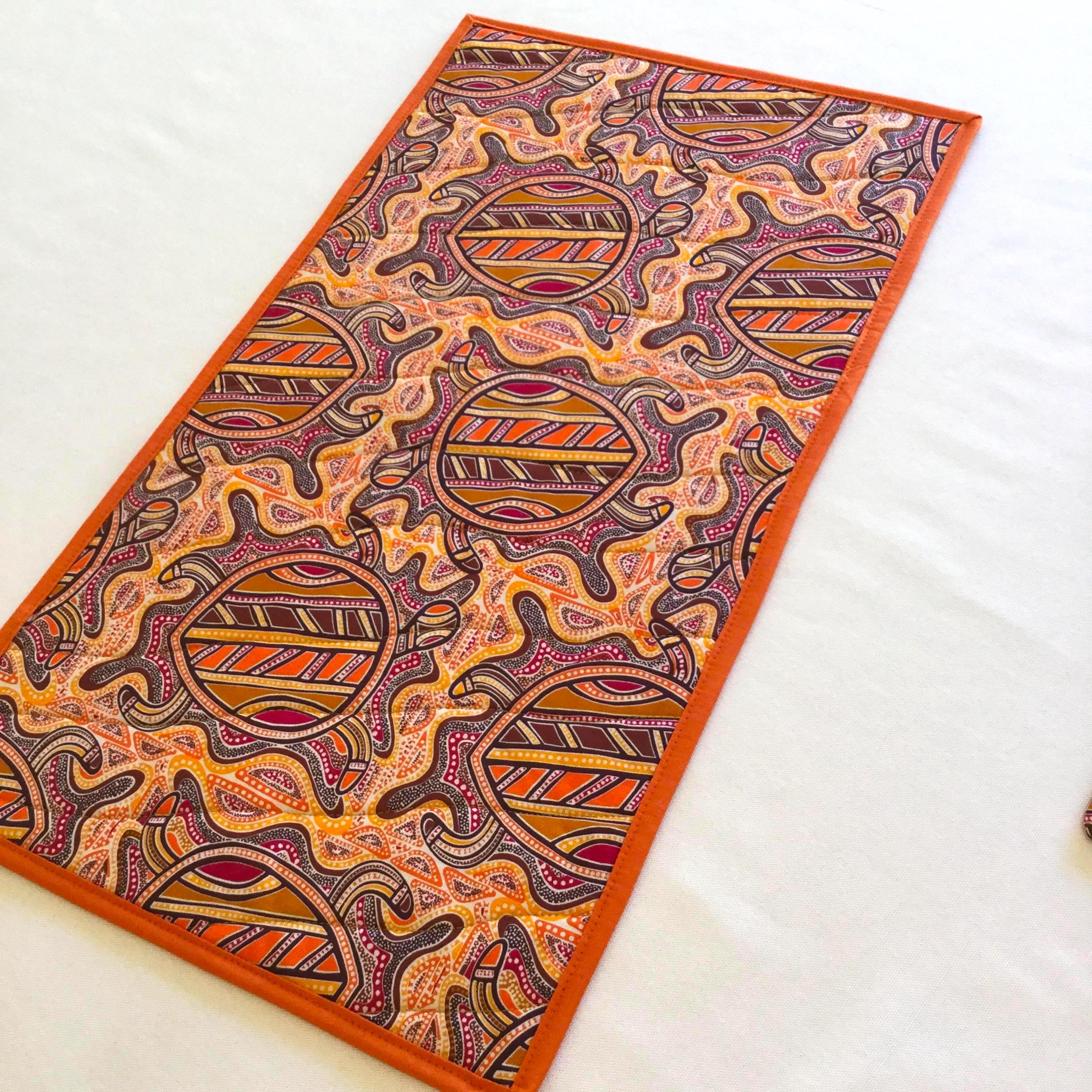 The quilting on this Jijaka ‘Sea Turtle’ Aboriginal Print Quilted Table Runner gives the effect of flowing water. The burnt orange binding really brings out the vibrant colours of this table runner. It is made from 100% cotton fabrics. An inner lining of fusible fleece accentuates the cushioned effect