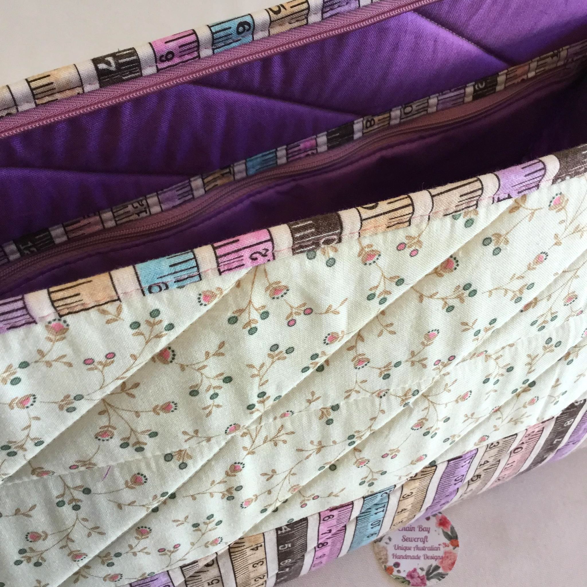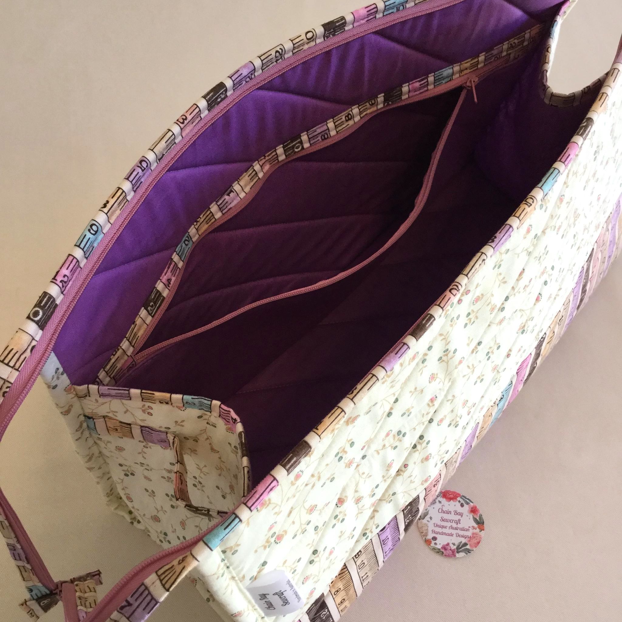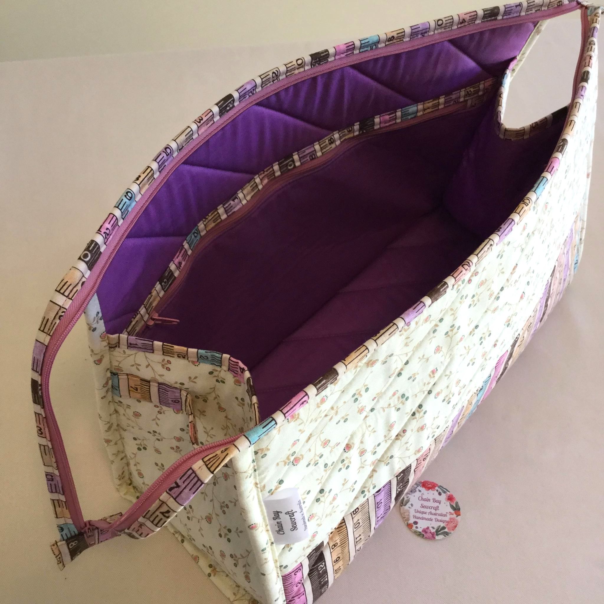 I have used a firmer quilted stabiliser to give structure to the bag exterior. Includes two inner pockets that go the whole length of the bag to store your craft tools. The bag opens wider with the longer zip allowing greater access to the contents