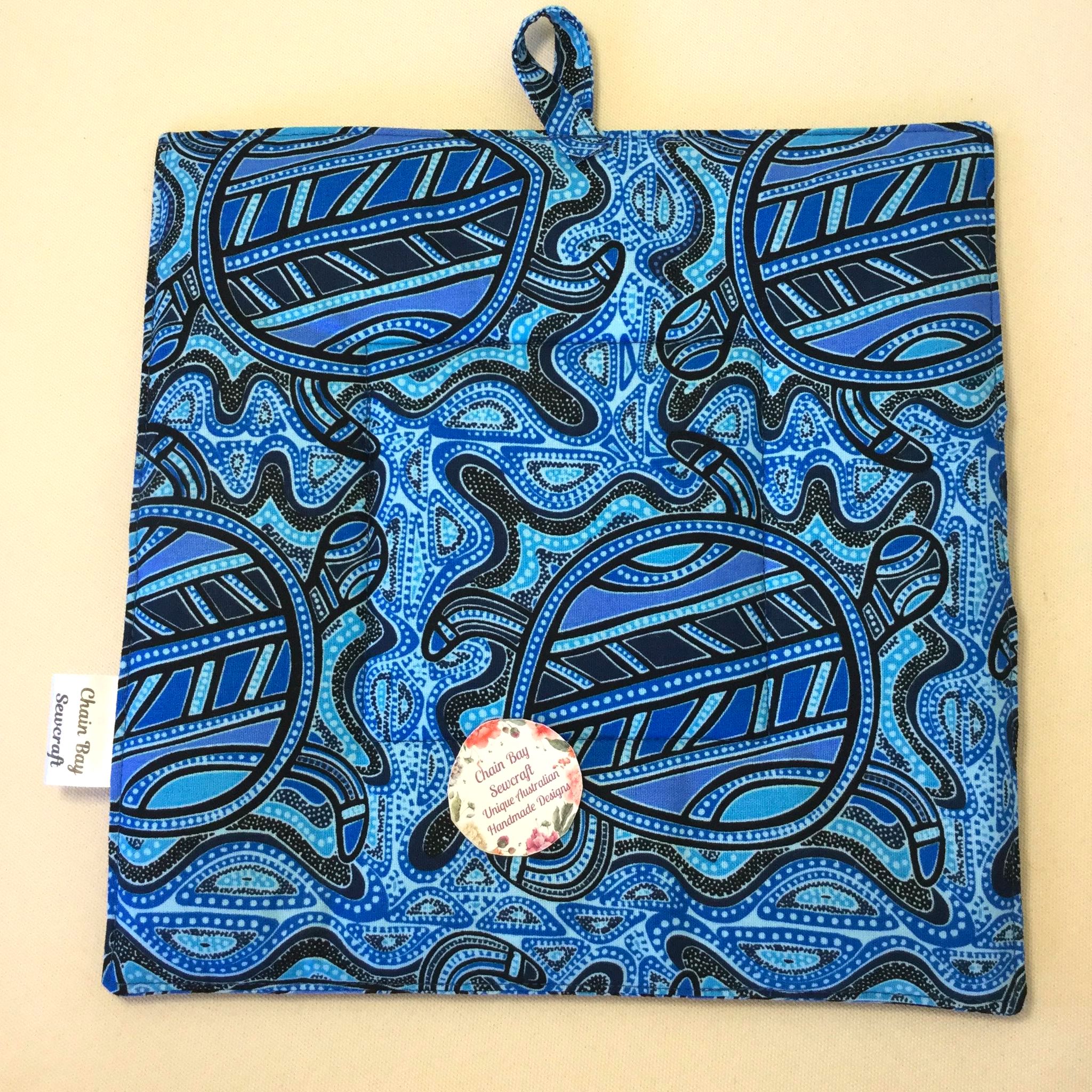 This Handmade Large Indigenous Pot Holder is made with stunning 100% cotton Aboriginal Jijaka Sea Turtles Blue fabric. It includes a hanging tab. The central top-stitched feature and edge top-stitching accentuate the cushioned look and feel to the pot holder. I have now extended my range to include stunning Indigenous Aboriginal Jijaka fabrics. Jijaka is an Aboriginal word meaning kangaroo and is a collection of artworks developed over twenty years by a collective of Aboriginal artists working for the Jumbana Group