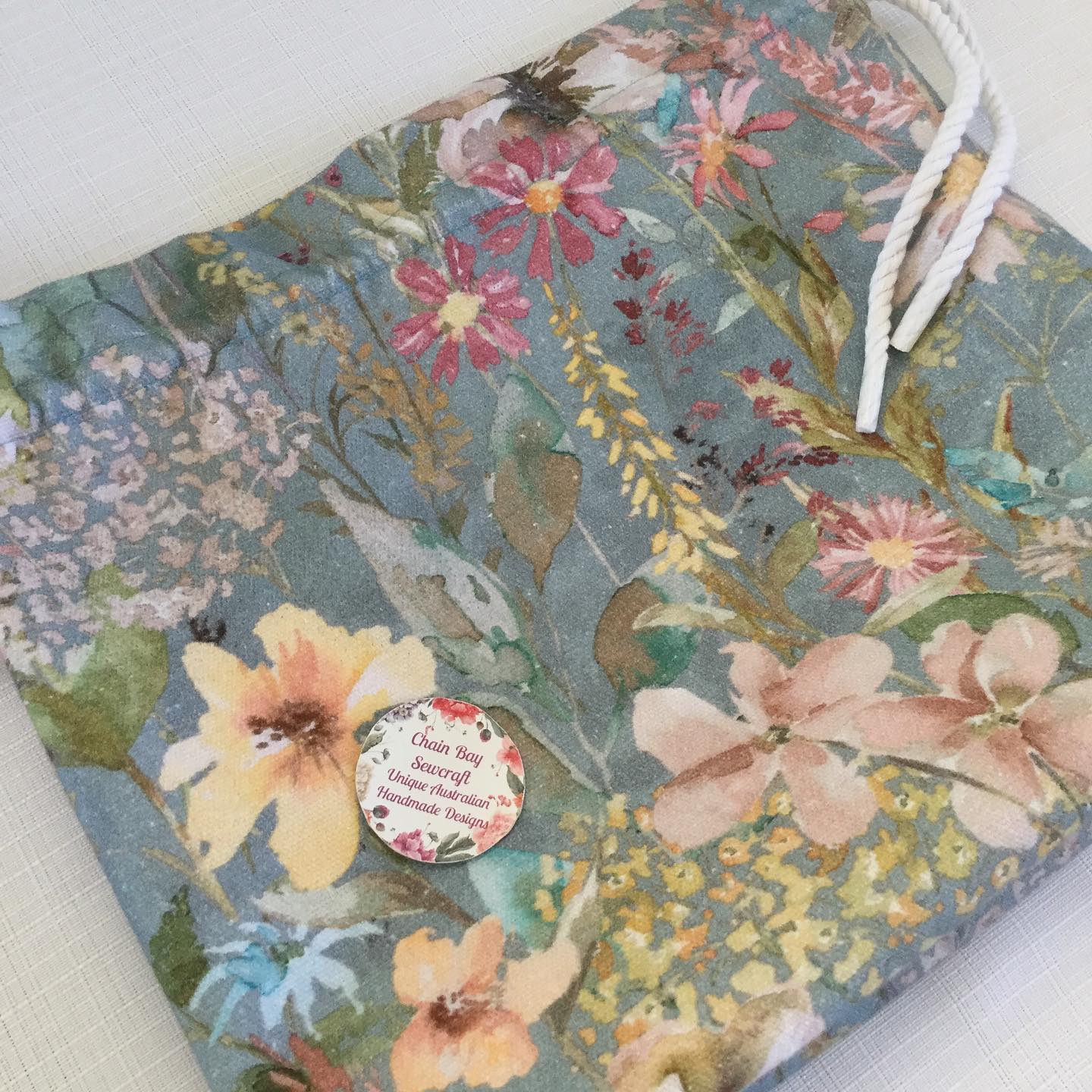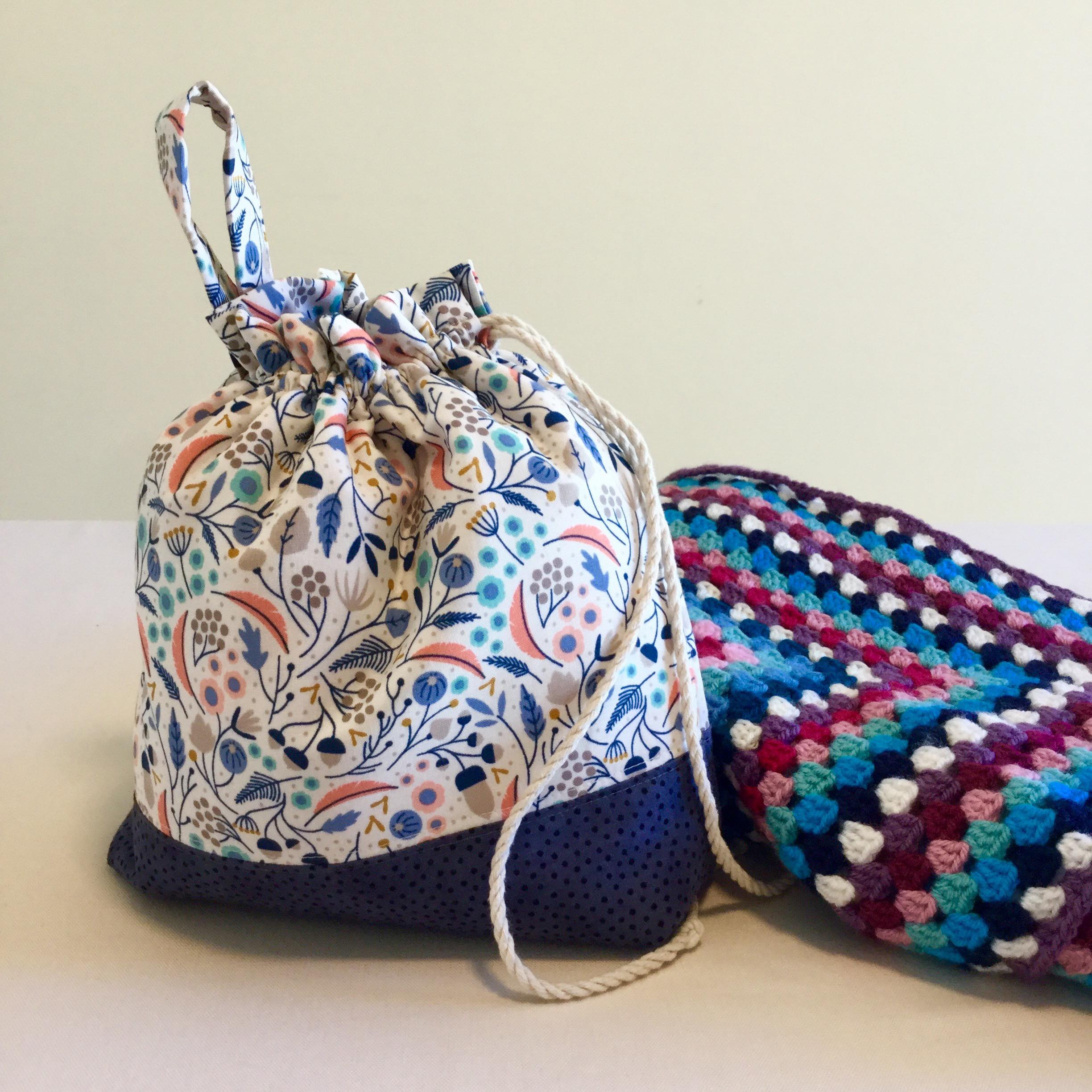 Handmade with strong canvas cotton cottage garden exterior fabric and a contrasting creamy cotton fabric. The bag has boxed corners which give greater depth to the bag, a drawstring top to secure your yarn with a cabled tie. It also has a pull tab handle to make the bag easier to carry around