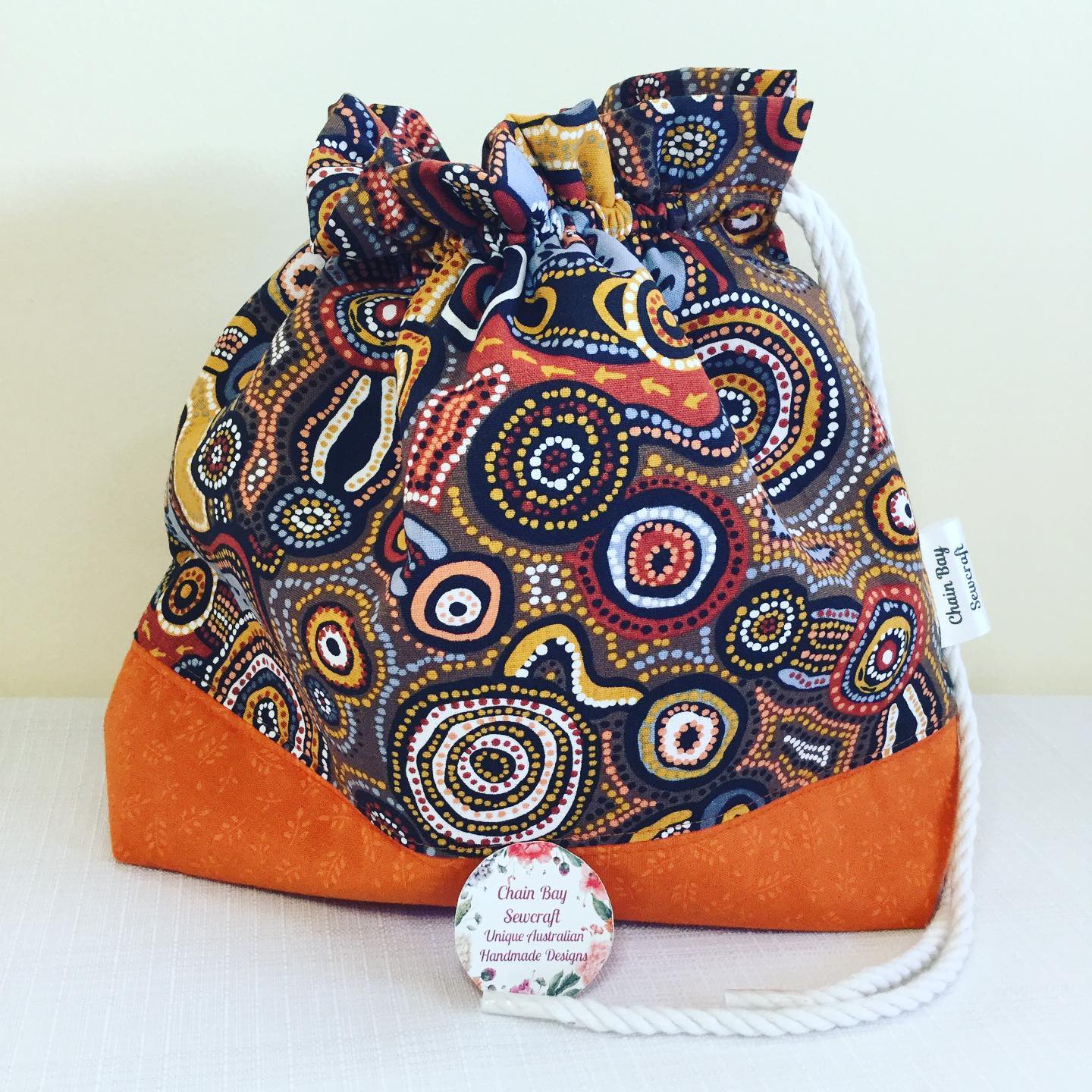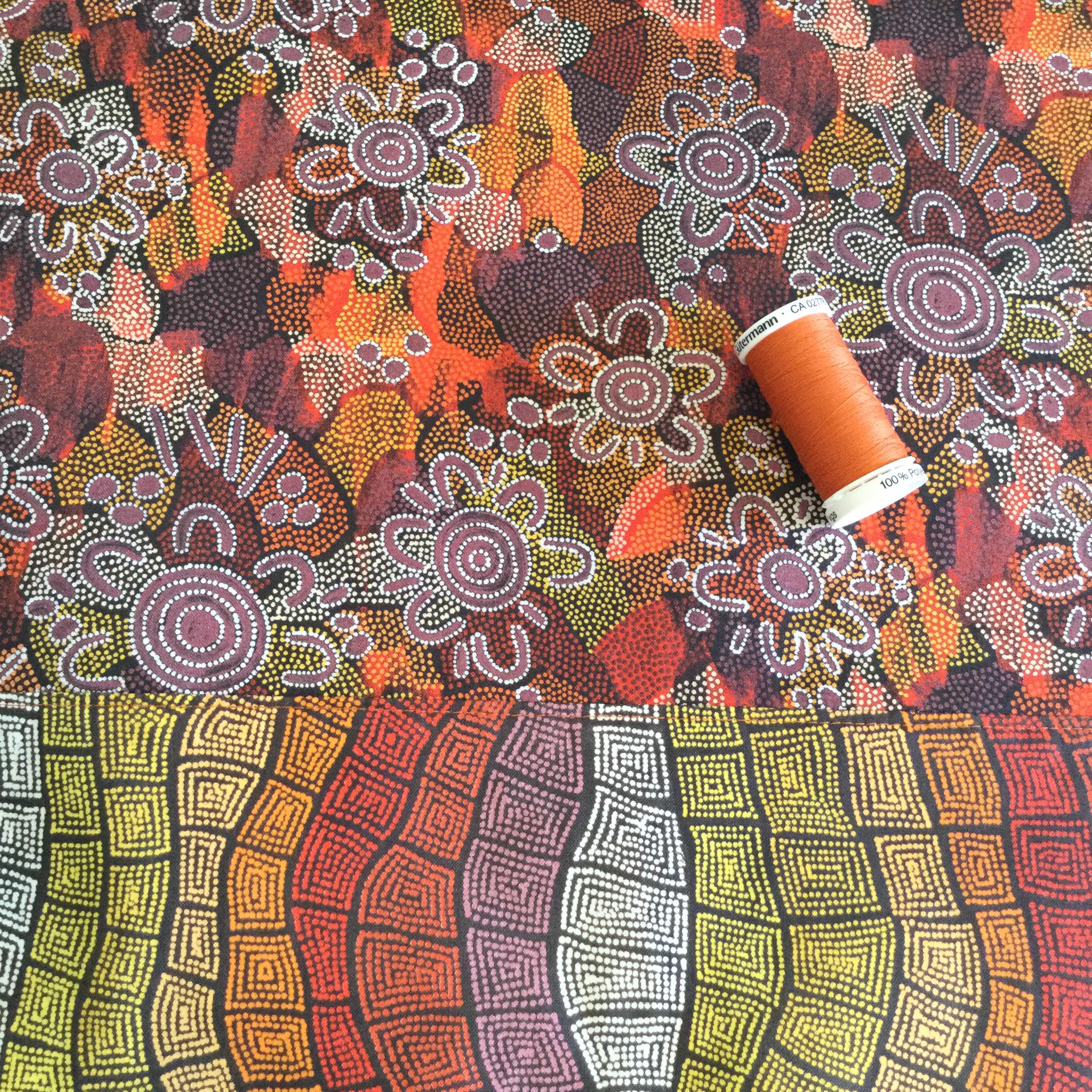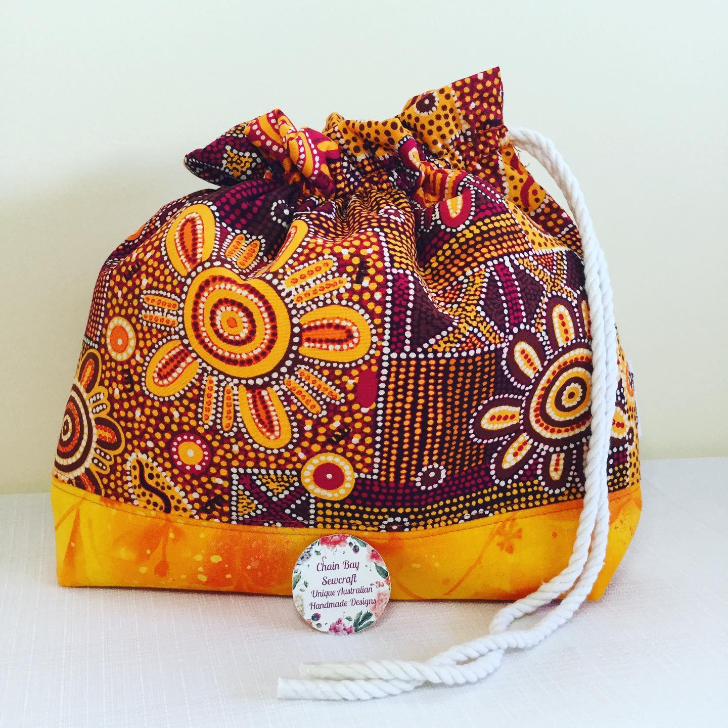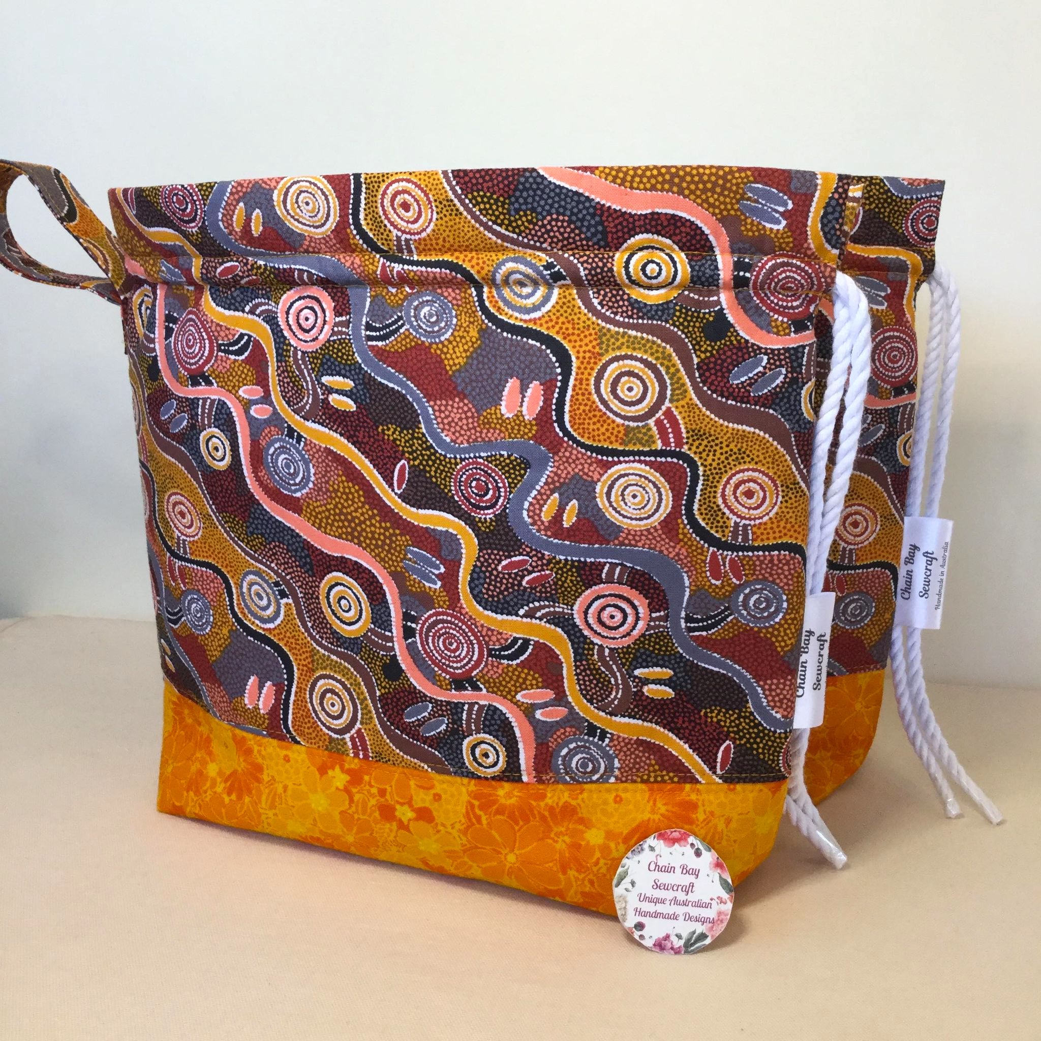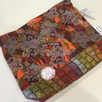 This Large Yarn bag looks simply stunning in the new ‘women’s dreaming’ fabric. It is designed to keep your yarn clean and stored away so you can relax and enjoy your crochet or knitting without chasing your balls around! Handmade with this stunning ‘Women’s Dreaming’ 100% cotton fabric by Indigenous artist Maureen Hudson Nampijinpa. **Two available and ready to post** I have now extended my range to include this stunning new fabric from a painting by Indigenous artist Maureen Hudson Nampijinpa. In the painting Maureen depicts large groups of women out searching for bush tucker after rain has softened the ground and stimulated growth. The women are the U shapes (the imprint on the ground when sitting) and beside them are their digging sticks, and the holes. The circles are important dreaming sites in Maureen’s country, called Warlukurlangu