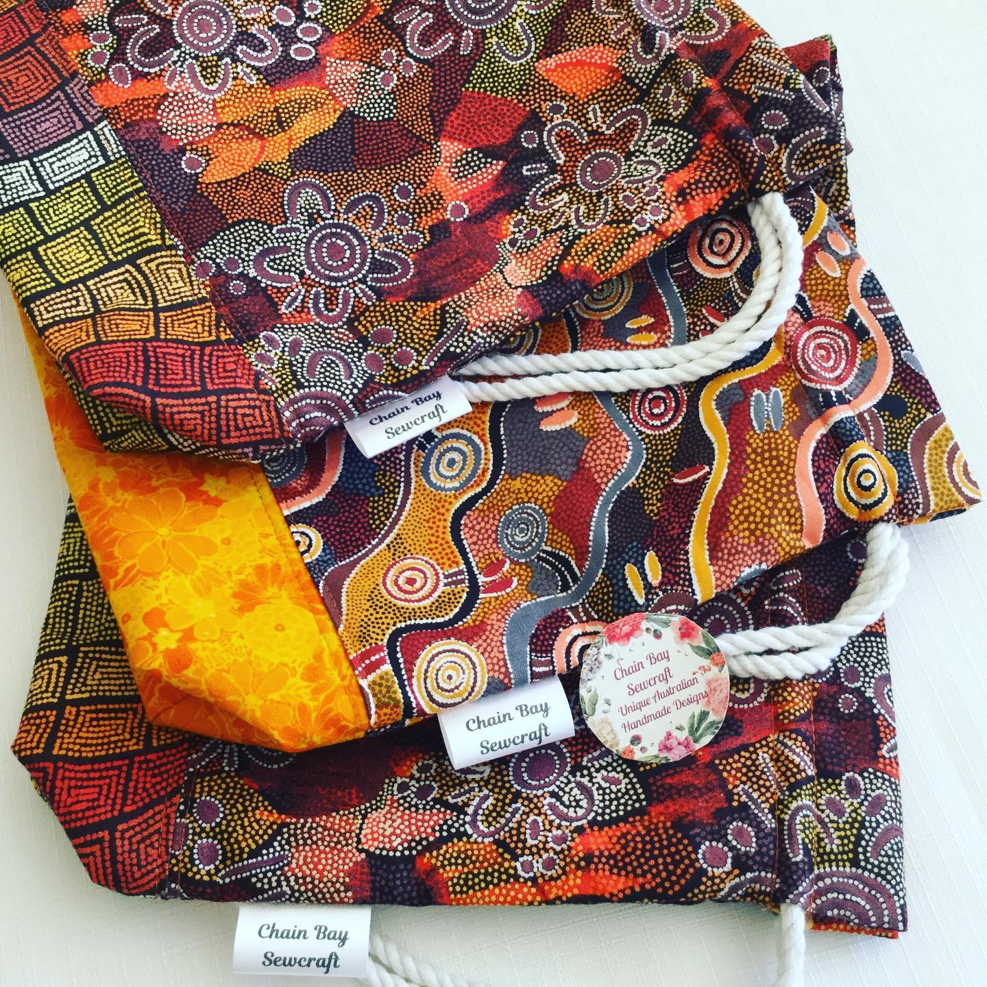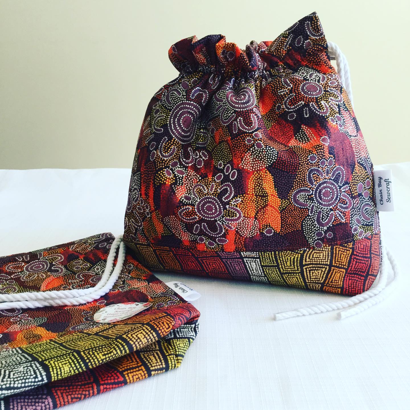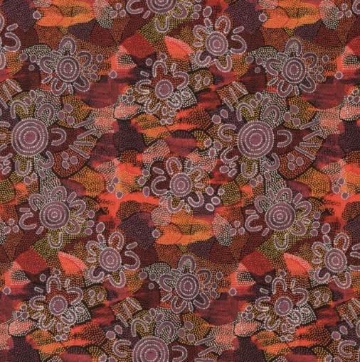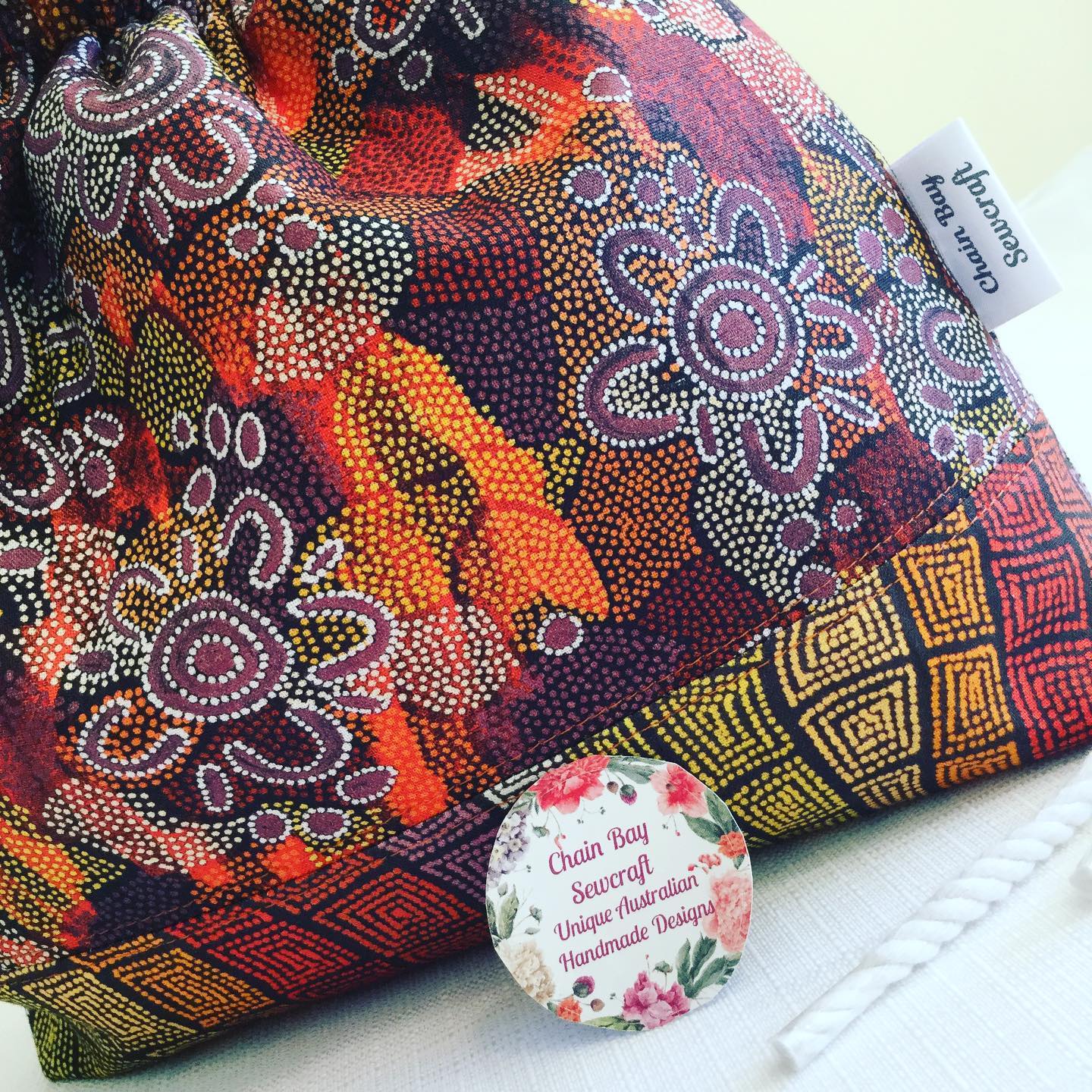 This Large Yarn bag looks simply stunning in the new ‘women’s dreaming’ fabric. It is designed to keep your yarn clean and stored away so you can relax and enjoy your crochet or knitting without chasing your balls around! Handmade with this stunning ‘Women’s Dreaming’ 100% cotton fabric by Indigenous artist Maureen Hudson Nampijinpa. **Two available and ready to post** I have now extended my range to include this stunning new fabric from a painting by Indigenous artist Maureen Hudson Nampijinpa. In the painting Maureen depicts large groups of women out searching for bush tucker after rain has softened the ground and stimulated growth. The women are the U shapes (the imprint on the ground when sitting) and beside them are their digging sticks, and the holes. The circles are important dreaming sites in Maureen’s country, called Warlukurlangu