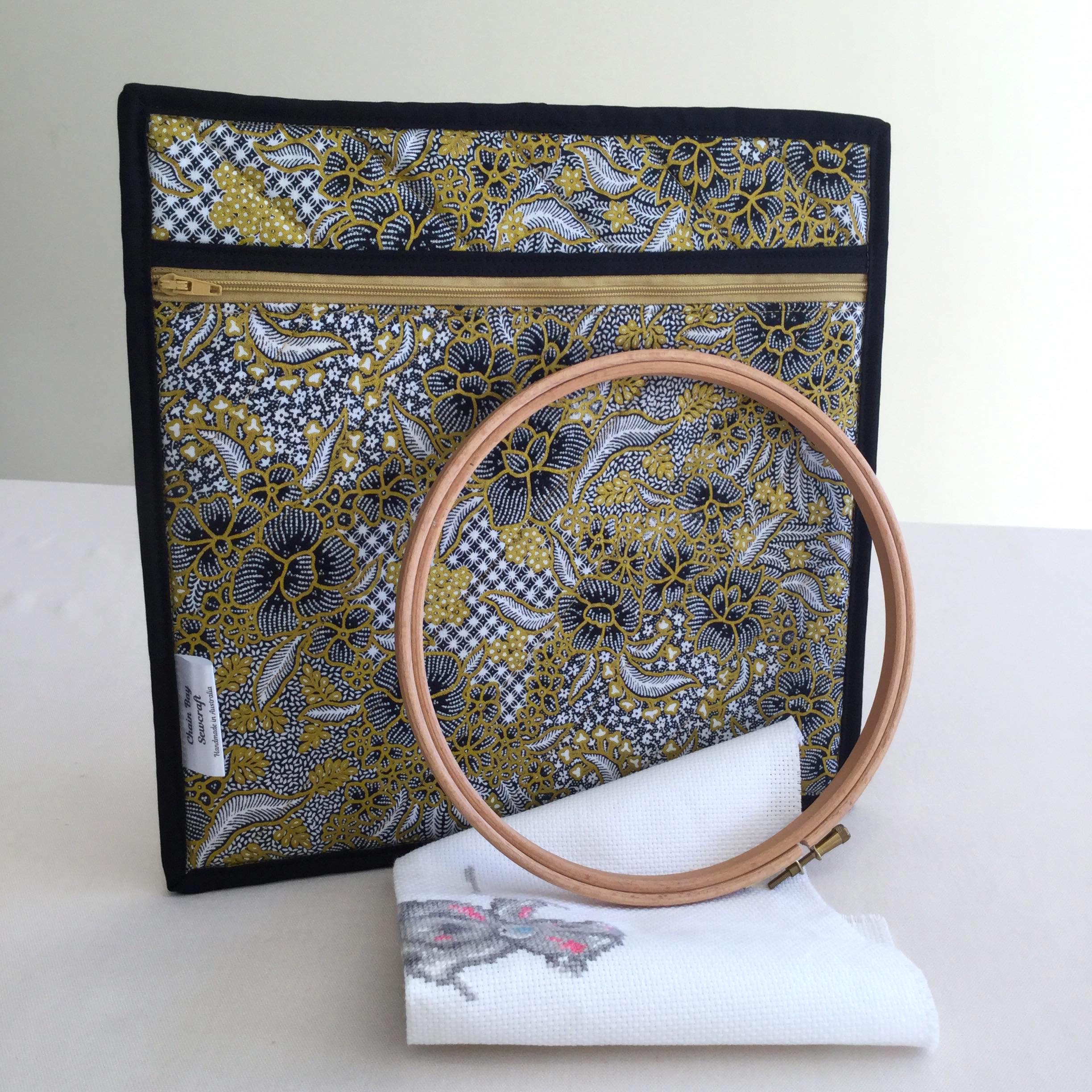 The quilted high-quality stabilizer gives a superior cushioned exterior. It has a zippered pocket at the front to hold your cross-stitch, sewing or canvas, embroidery hoop and accessories. It also has a sleeved pocket at the rear to keep your patterns or magazines safe
