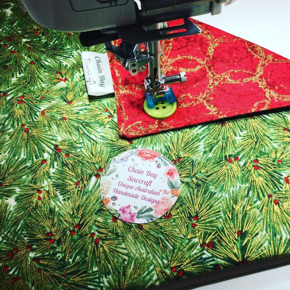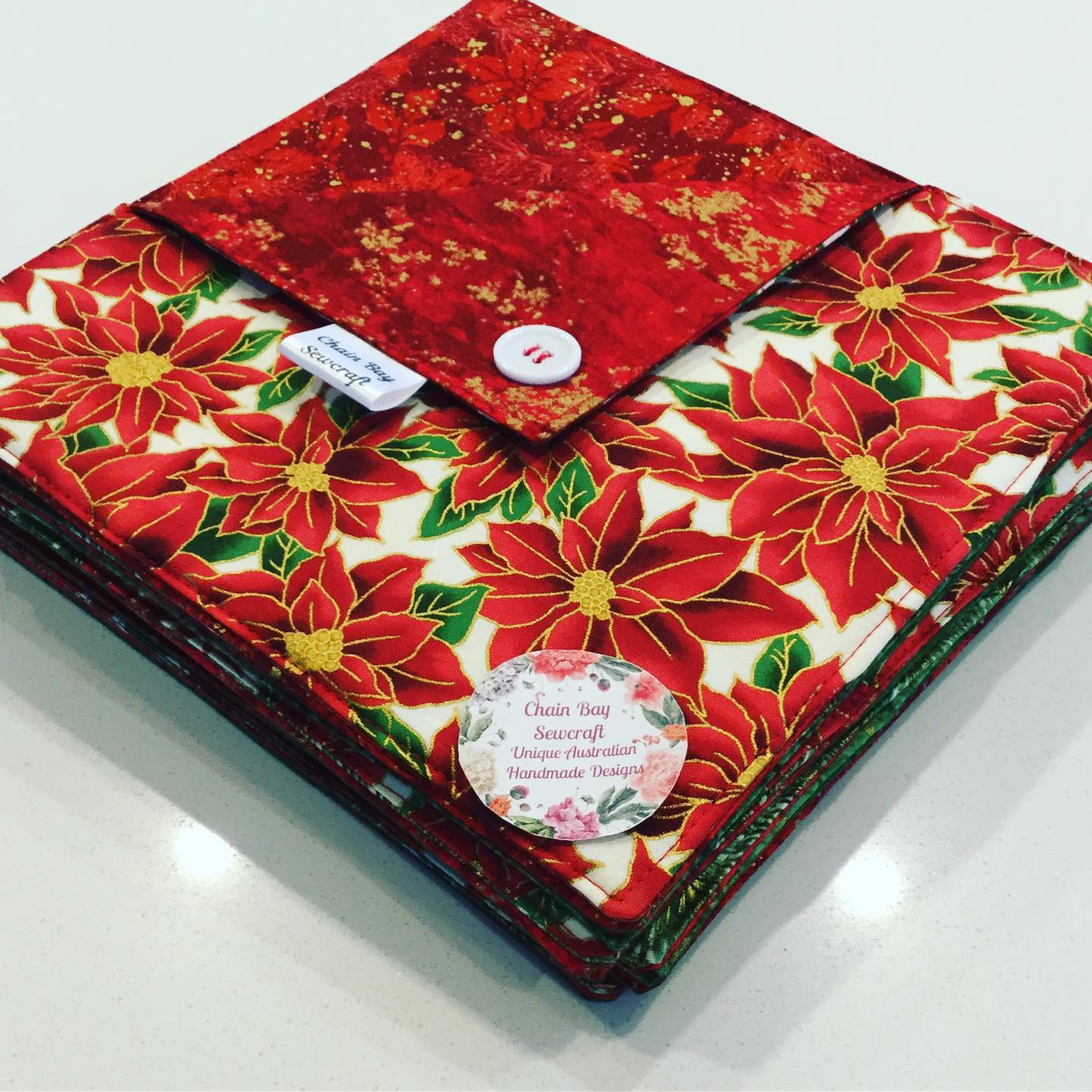 Brighten your table with a stylish Chain Bay Sewcraft Handmade Festive Napkin Holder. You’ll have no more napkins flying away in the wind as they’ll be safely secured in the holder. This stunning mistletoe fabric contrasting beautifully with the red gold and green gold fabric
