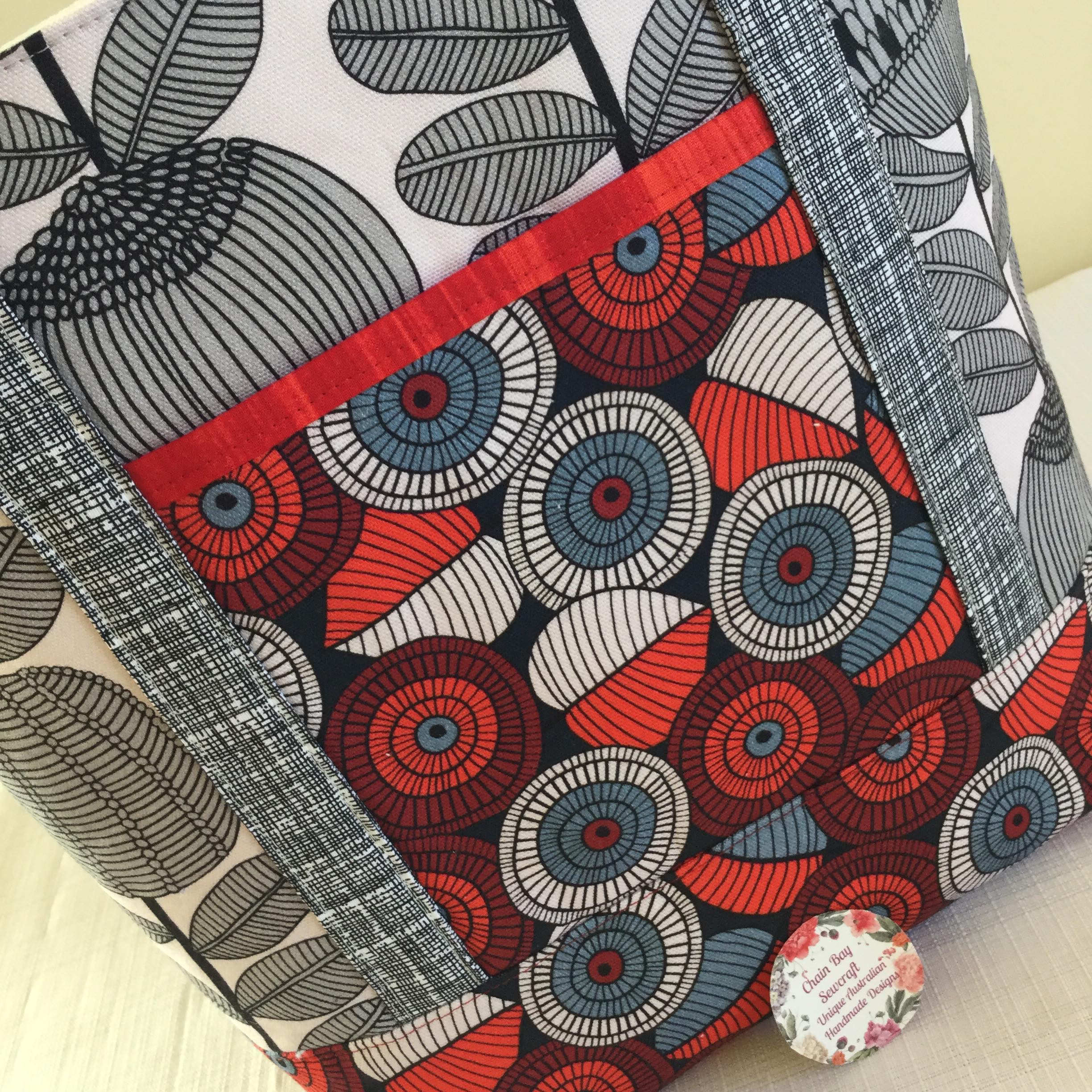 I designed and created this Handmade Market Tote Bag. An ideal bag for going out and about. You’ll get plenty of compliments with these eye catching fabrics 🙂 It is complimented with a 100% cotton silver wattle lining