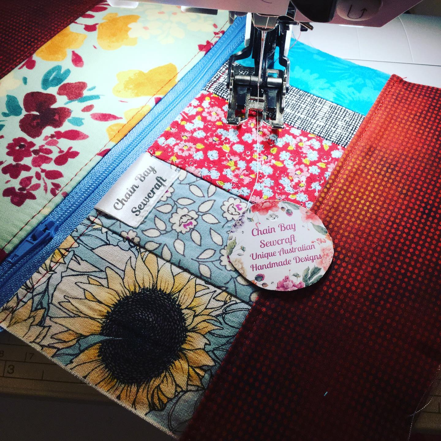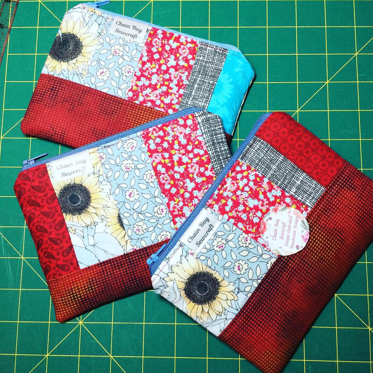 Truly unique patchwork pouches. Only three available so get in quick! I made these fun Patchwork Zippered Pouches from scrap fabrics as I never like to waste scraps from the beautiful fabrics whilst creating. Designed by me and great for organising your craft items, make up, jewellery, cosmetics etc. Made with quality 100% cotton fabric and contrasting chequered lower red band and dusky blue lining fabric. Fits easily in to your handbag or travel bag