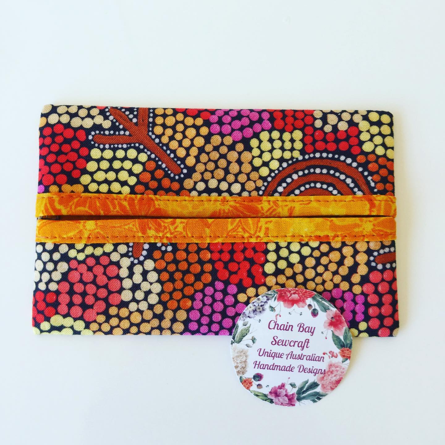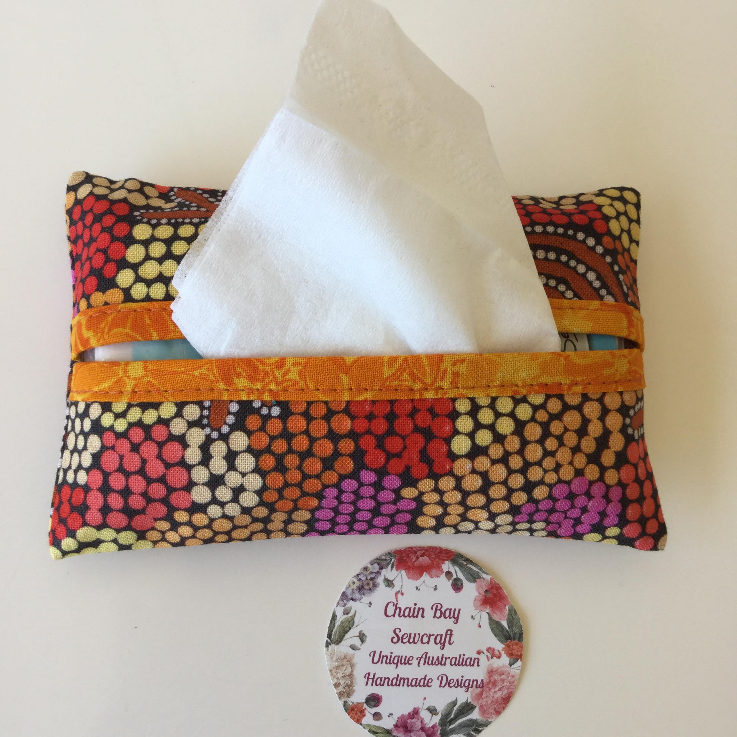 The new Chain Bay Sewcraft Pocket Tissue Pouches are fun to make. The fabric combinations are endless so I’ll have fun with this one! 🙂 Available in stunning 100% high quality cotton ‘wedge tailed eagle dreaming’ fabric by Indigenous artist Glorine Nungarrayi Martin. They are extremely lightweight, adding little or no weight to your bag. A great way of storing your pocket tissues and quick and easy to find in your bag with the range of stylish fabrics
