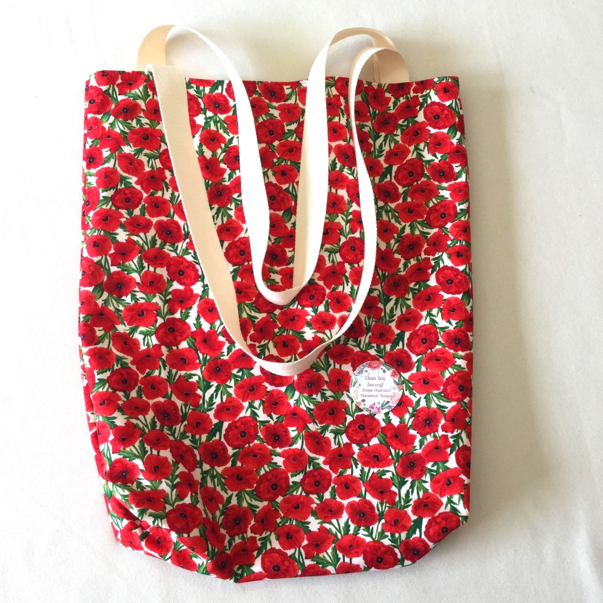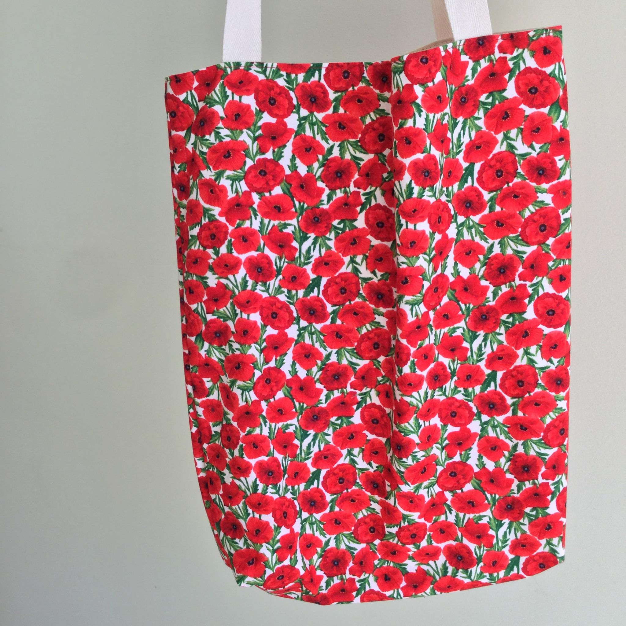 This bright cream poppy fabric makes this a beautiful Reversible Tote Bag. It contrasts beautifully with the cream calico lining. Handmade with 100% cotton exterior and lining fabrics. It has one pocket on the inside. This is the last one as the fabric is no longer available to purchase