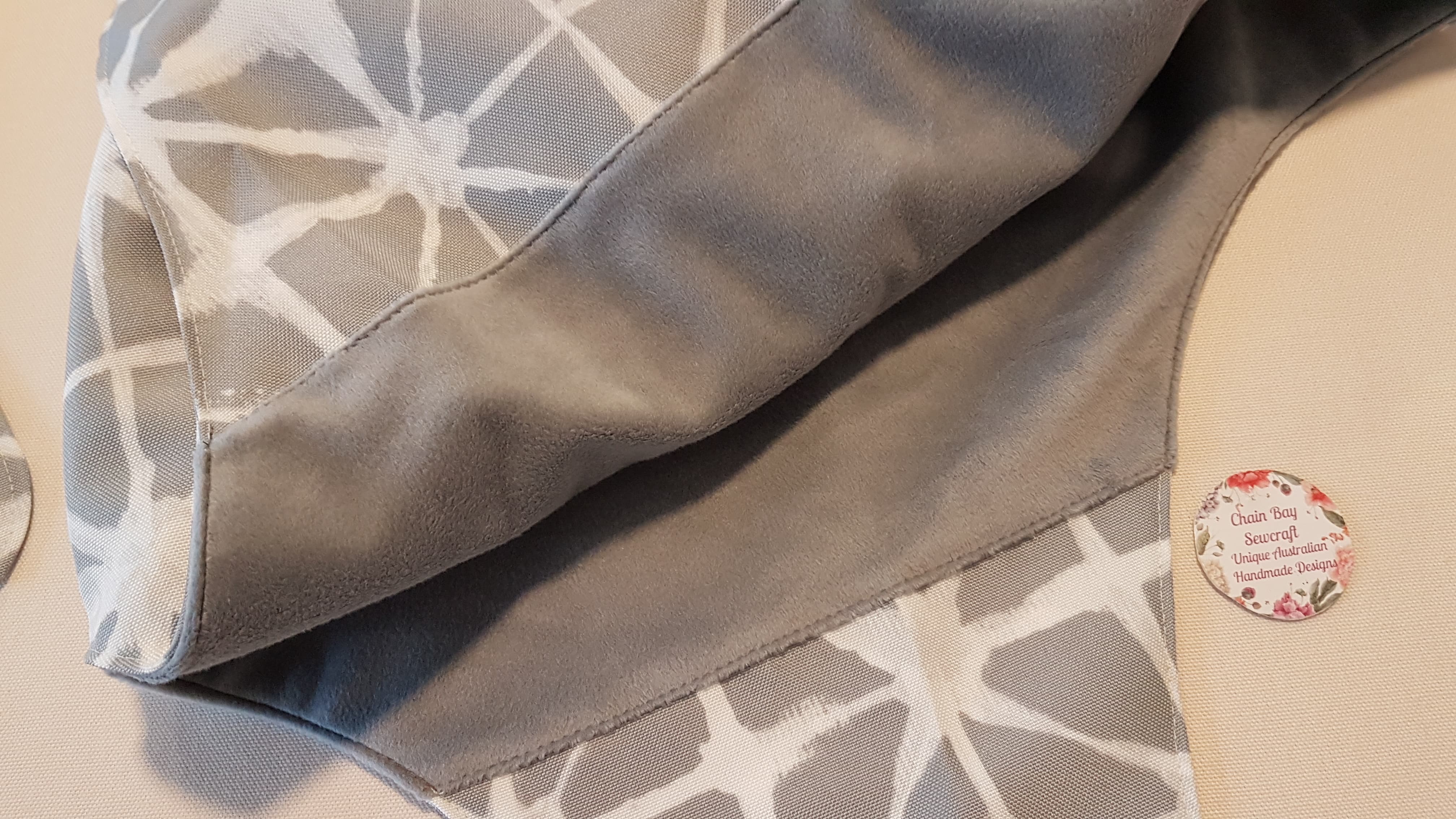 Fabrics: Grey weatherproof canvas exterior/silver-grey minky fleece thermal lining