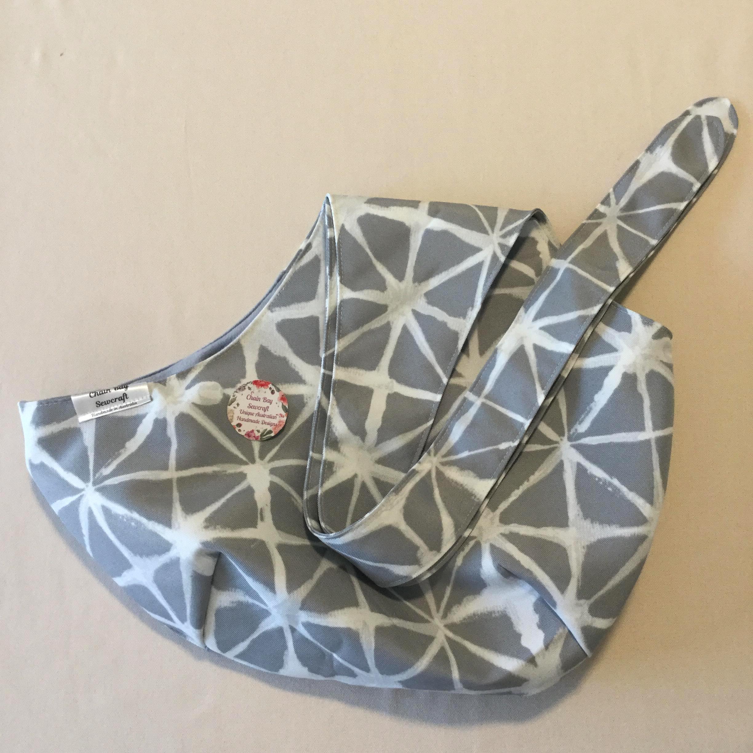 The sling has a grey shibori weatherproof canvas exterior fabric and minky fleece thermal internal lining. This combination ensures that your furry friend will stay warm and snug in all weathers. This is great for smaller pets who are older or unwell but still like to get out and about. Machine washable on a cool, quick wash