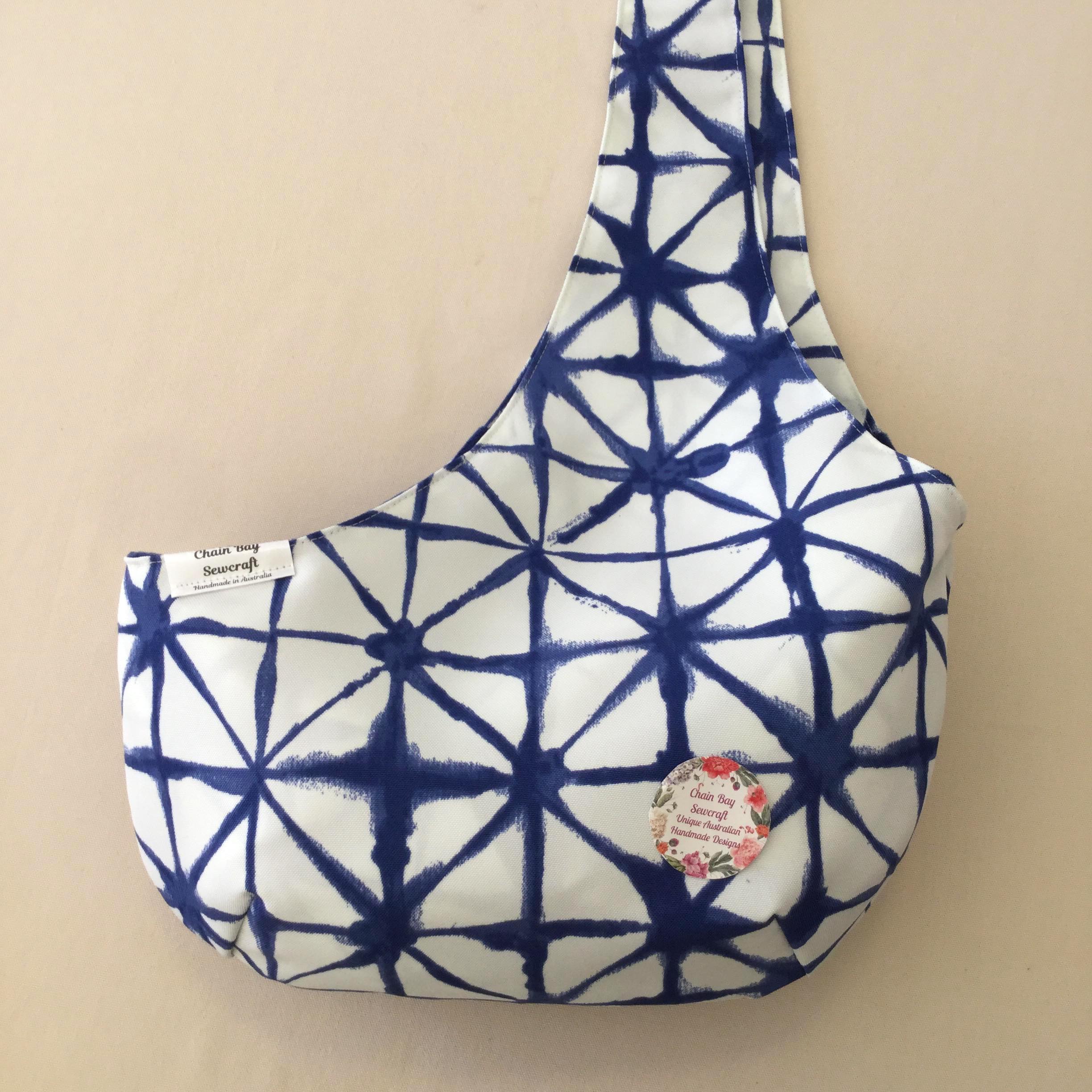 The sling has a white & blue shibori weatherproof canvas exterior fabric and minky fleece internal lining. This combination ensures that your furry friend will feel safe and secure and stay warm and snug in all weathers. This is great for smaller pets who are older or unwell but still like to get out and about. Machine washable on a cool, quick wash